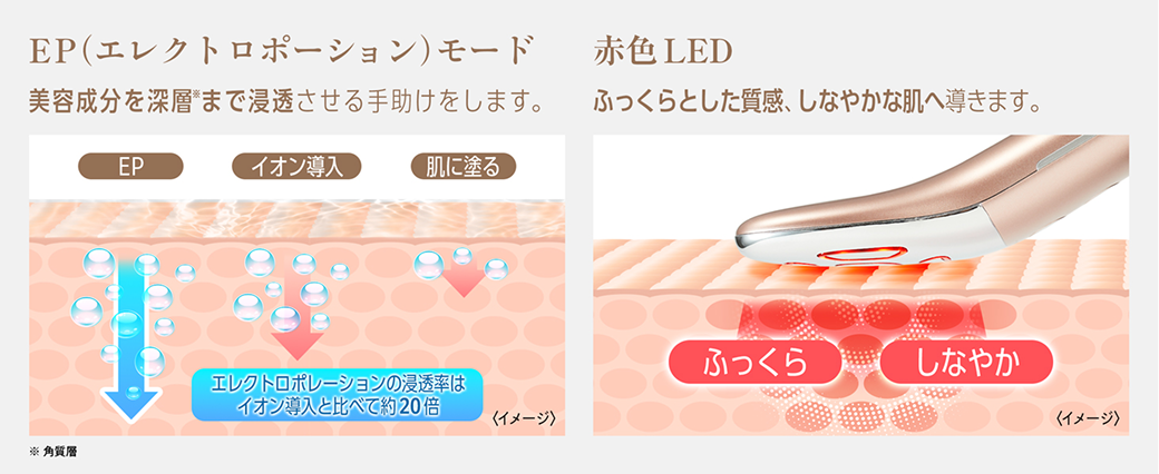 EP(エレクトロポーション)モード(赤色LED) 美容成分を深層まで浸透させる手助けをします。