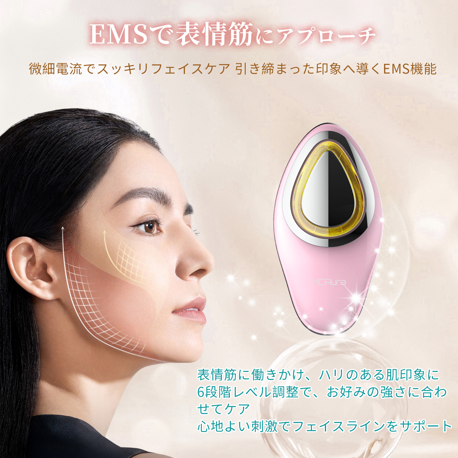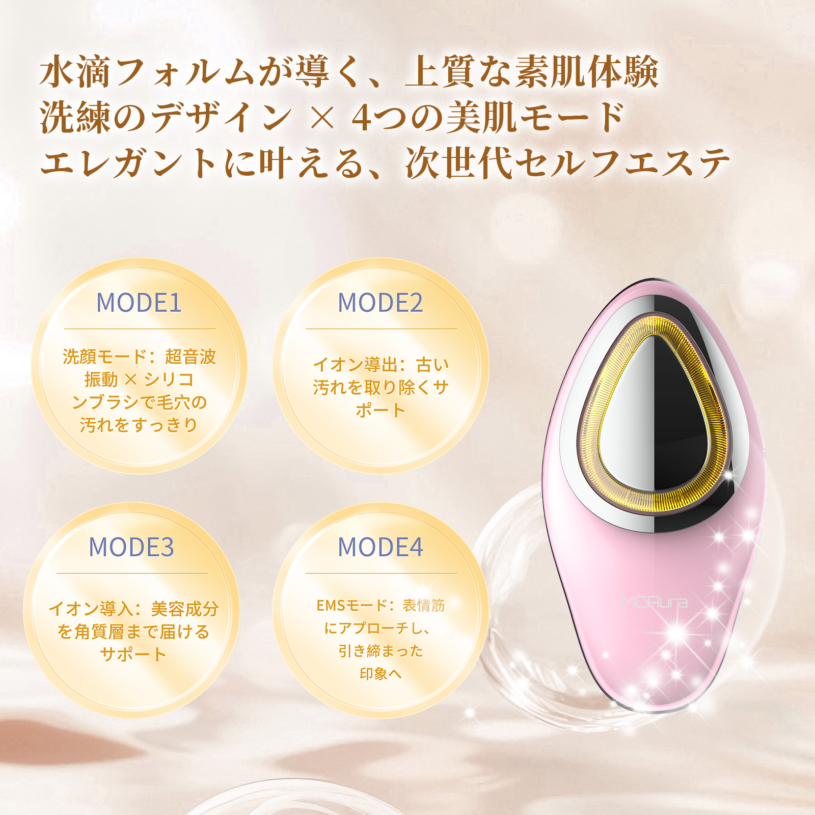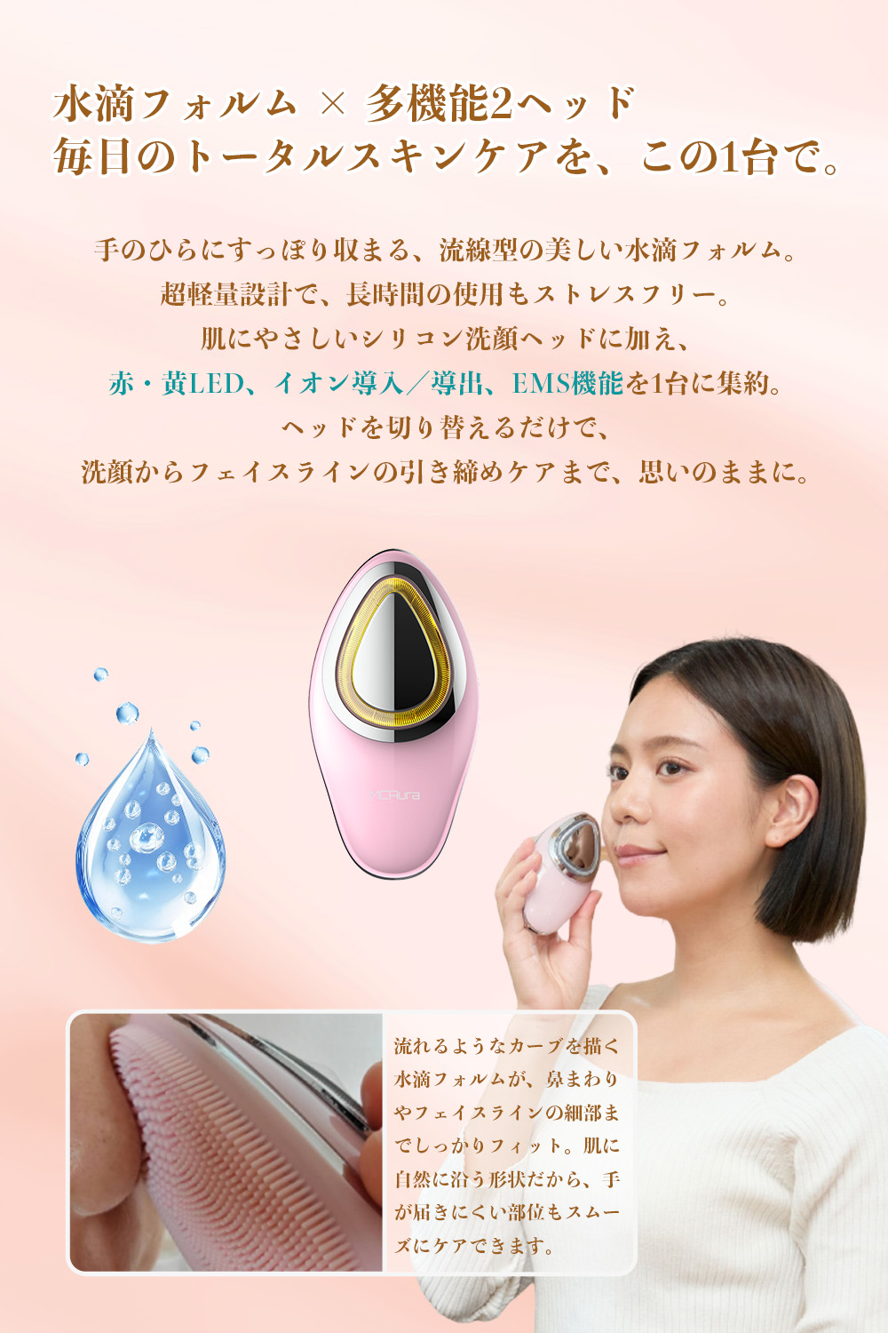 【毛穴ケア+美肌ケアのWアプローチ】 MCAura 洗顔ブラシ・美顔器は、顔のラインに沿う水滴型フォルムを採用した多機能ビューティーデバイスです。 従来の丸型ヘッドでは届きにくい小鼻まわりやフェイスラインにもフィットし、洗顔やスキンケアタイムをサポートします。 洗顔とスキンケアを1台で気軽に取り入れられ、EMS微電流・赤色/黄色LED・42℃恒温温熱・イオン導入/導出 などの機能を搭載。 6段階レベル調整、電流センサー、自動オフ機能も備え、ご自宅での毎日の美肌ケアを快適に支えます。 ※本製品は医療機器ではありません。 ※ご使用感や効果には個人差があります。