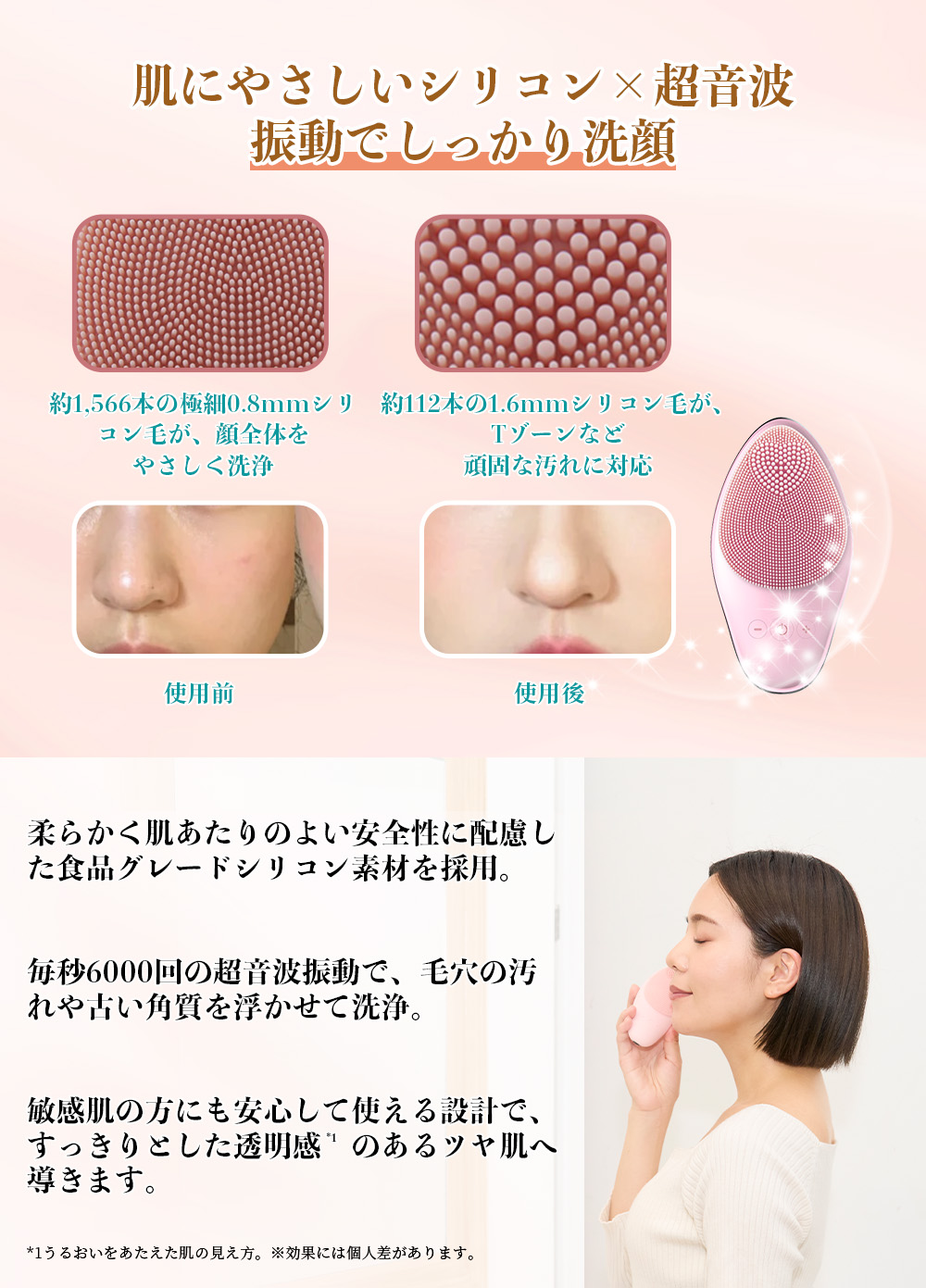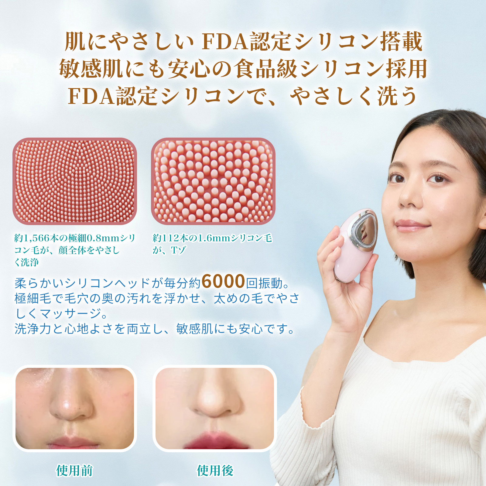 【安心して使える敏感肌対応設計】 美顔器の電動洗顔ブラシヘッドには、食品グレードシリコンを採用。 柔らかい素材が肌にやさしくフィットし、敏感肌の方にも配慮した設計です。 洗顔モードご使用の際は、同じ部分に長時間当てず、1か所につき約15秒、顔全体で約1分を目安にしてください。 イオン導出/導入/EMSモードは、自動設定された時間で動作し、適切なケア時間をサポートしま