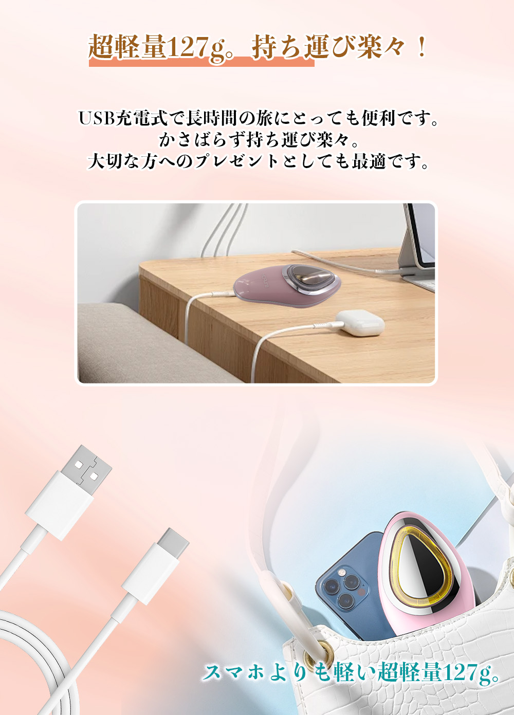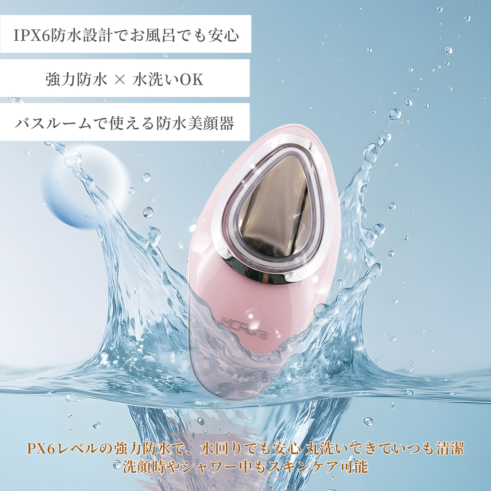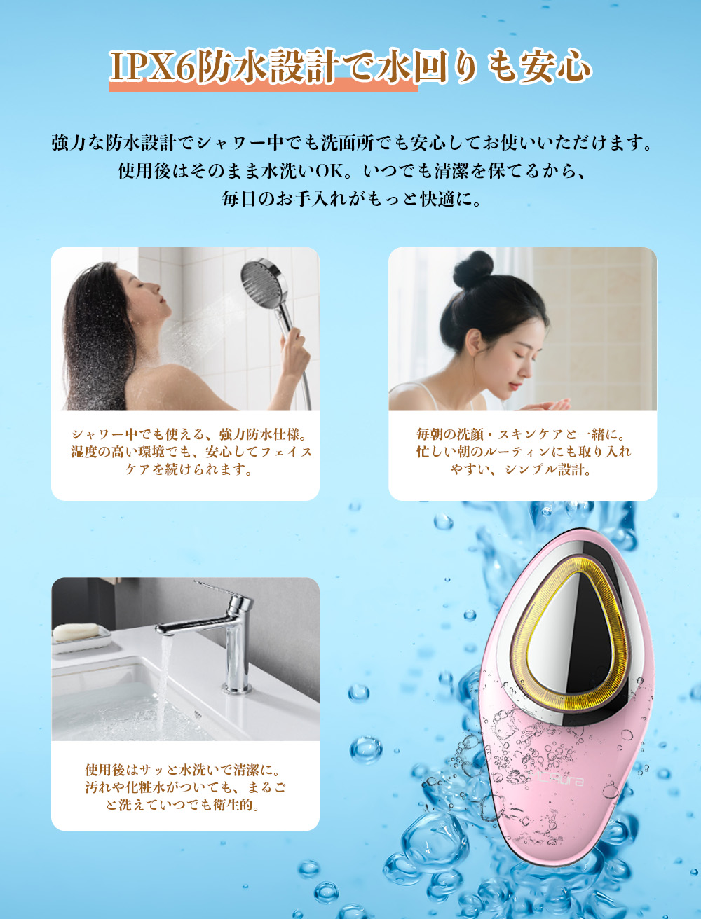 【軽量&防水設計&持ち運びやすさ】 手のひらサイズの軽量コードレス設計で、旅行や出張にも便利。 IPX6防水仕様だから、お風呂場でも安心してお使いいただけます。 イオン導出/導入/EMSモードには約4分の自動停止タイマーを搭載。 過度な使用を防ぎながら、毎日のスキンケアを快適にサポートします。