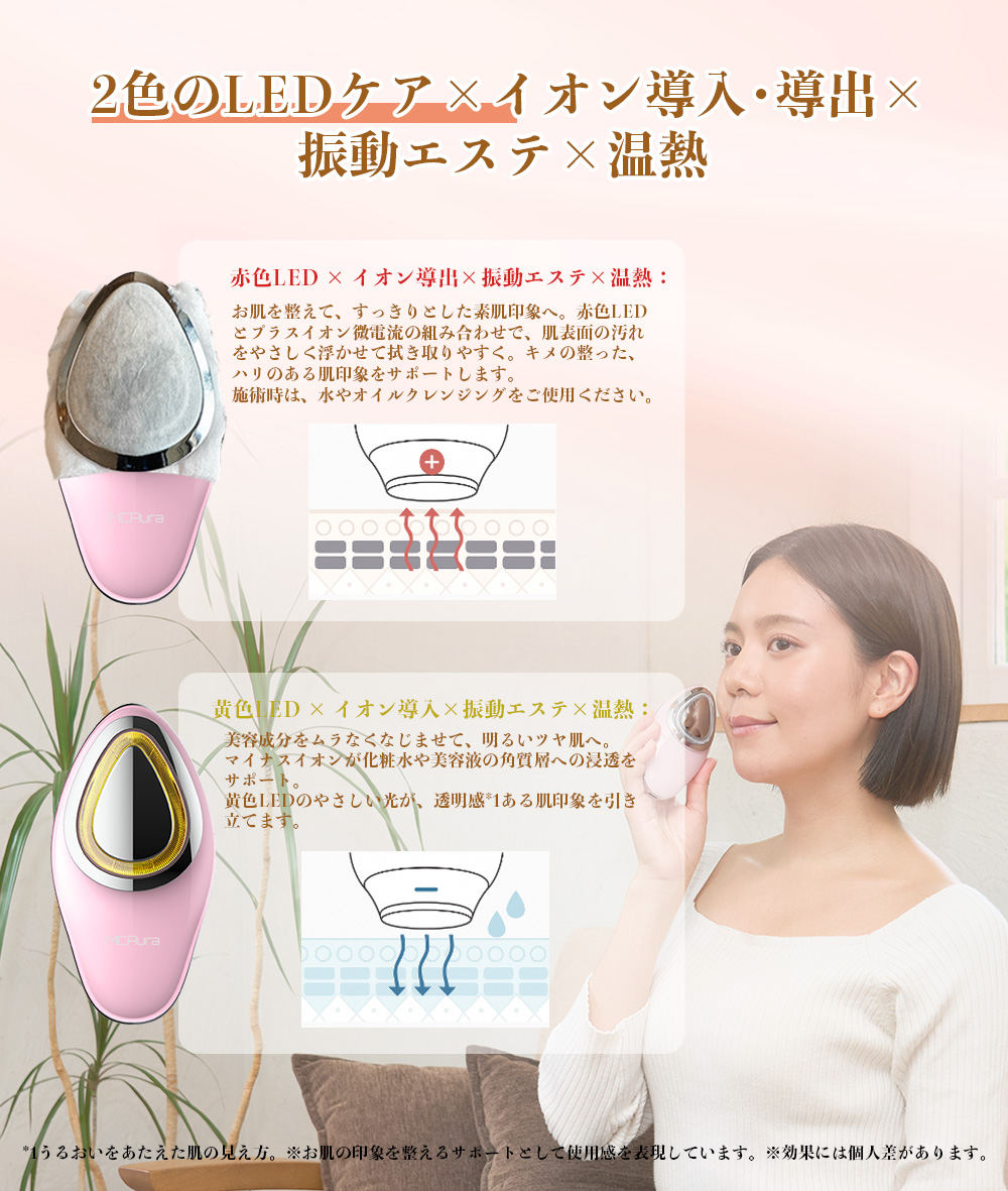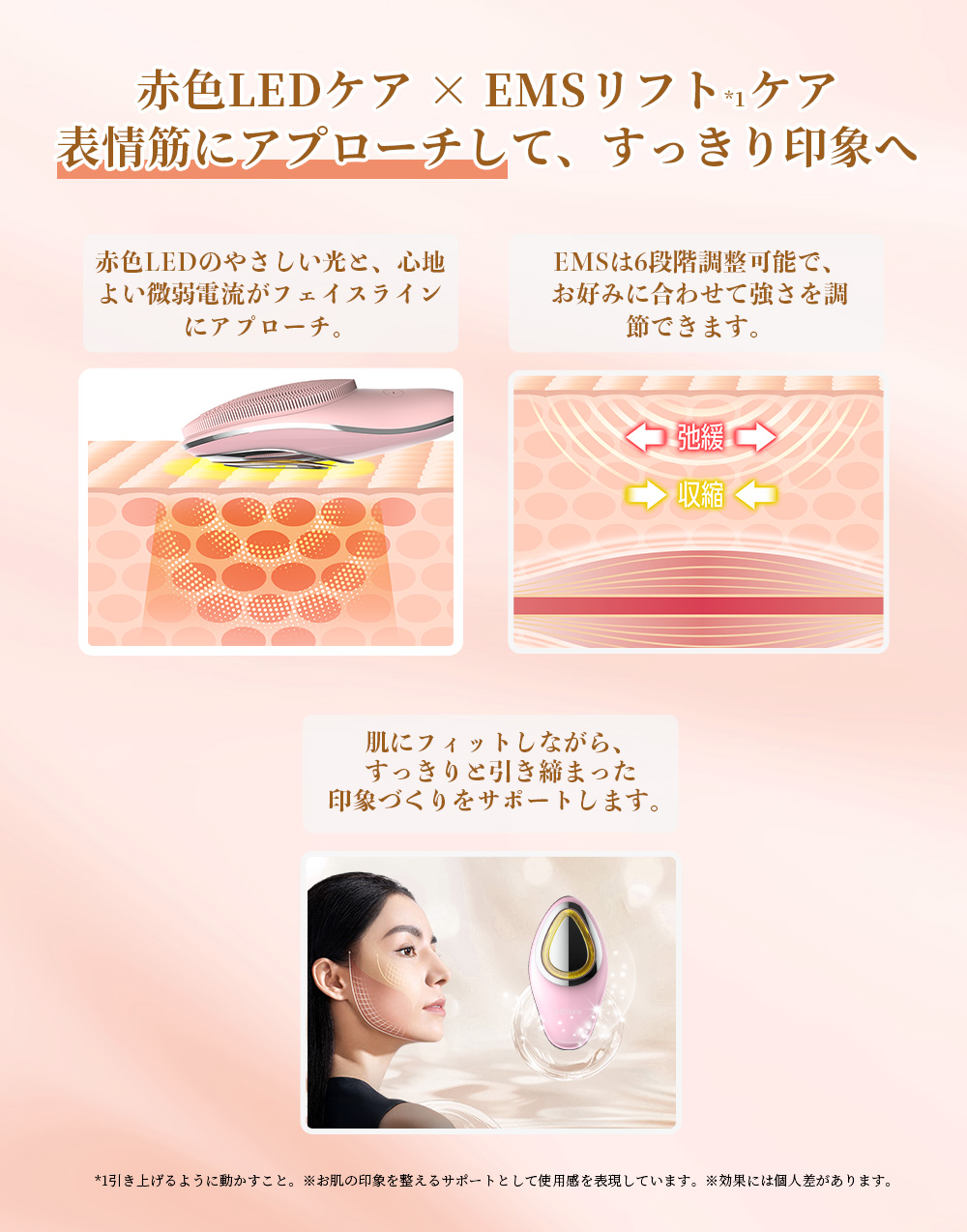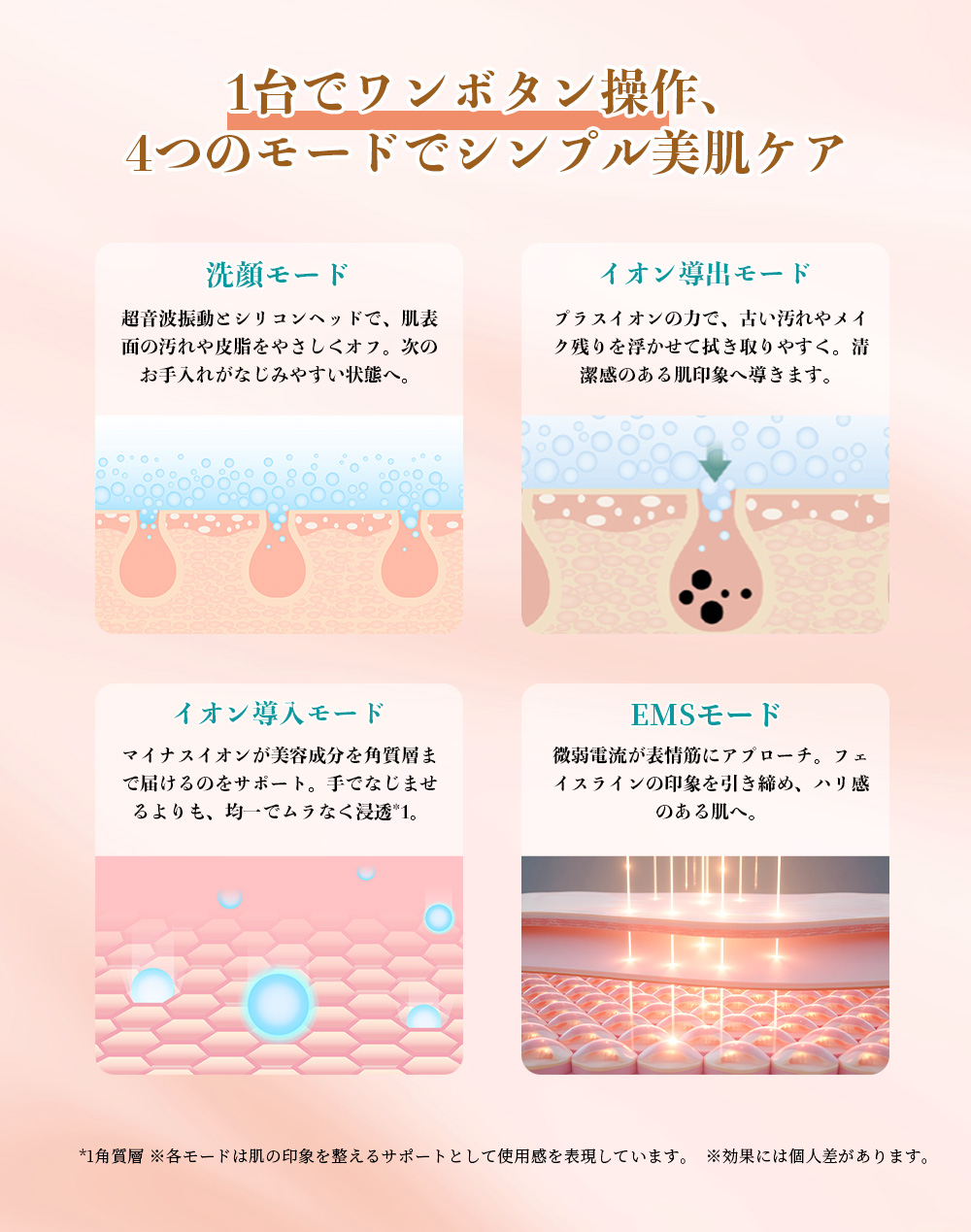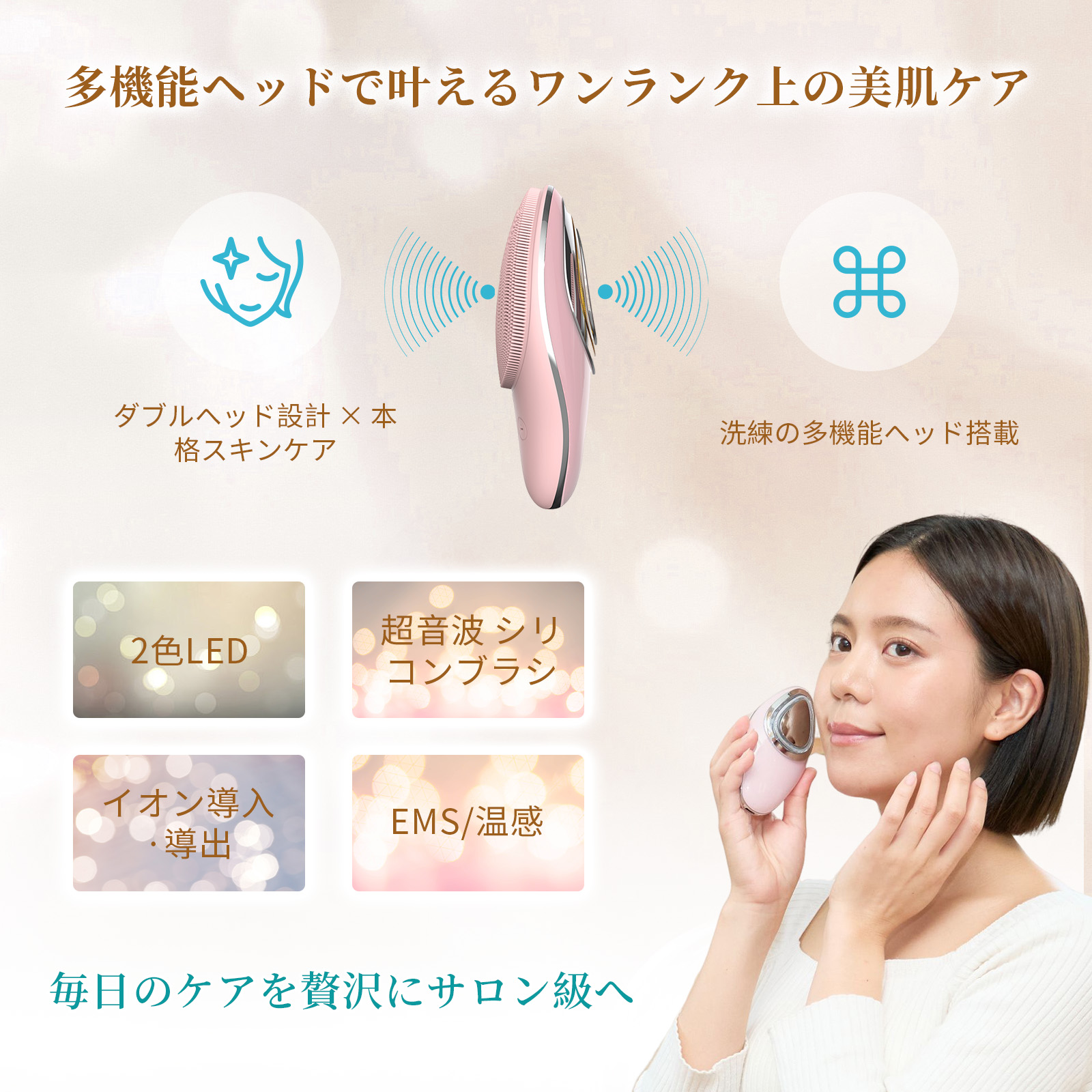 【4つのモード × 7つの機能】 初心者にもやさしい洗顔・美顔器。イオン導出/導入/EMSモードは動作時間があらかじめ設定されているので、迷わず快適にケアを始められます。 ✅ クリーンモード(電動洗顔ブラシ+振動) シリコンブラシと毎分最大6,000回の微細振動で、毛穴まわりの汚れや余分な皮脂をやさしくケア。 化粧前の肌ケアをサポートし、通常の洗顔では届きにくい部分にもアプローチ。 1回約1分で清潔感のある肌印象へ。 ✅ イオン導出モード(赤色LED+42℃温熱+振動) 42℃の温感と赤色LEDが古い角質や皮脂のケアをサポート。 毛穴まわりを整え、明るい印象の肌をめざすケアに。 「疲れて見える」「肌の印象が気になる」と感じる方にも取り入れやすいモードです。 ✅ イオン導入モード(黄色LED+42℃温熱+振動) 美容成分を角質層まで届けるサポートで、うるおい感のある肌印象へ。 化粧水や美容液のスキンケアタイムを支え、乾燥しやすい季節にも活躍。 ※浸透は角質層まで。 ✅ EMSモード(赤色LED+EMS微電流) 微弱電流で表情筋にアプローチし、フェイスラインの印象ケアをサポート。 すっきりとした印象をめざすケアに。 フェイスラインが気になる方にも取り入れやすいモードです。 ???? 4つのモードはすべて 6段階で強さ調整可能。 イオン導出/導入/EMSモードは約4分で自動停止、さらに1分間操作がない場合は自動的に電源オフになる安心設計。 ※本製品は医療機器ではありません。ご使用感や効果には個人差があります。