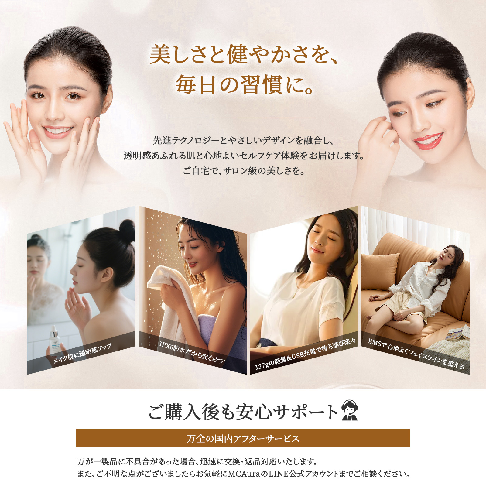 【製品仕様・保証・サポートについて】 ⚙ 製品仕様 製品名:MCAura / MC2511 LiftPulse マルチ機能洗顔&美顔器 サイズ:約 W120 × D62 × H41mm 重量:約127g セット内容:本体、Type-C充電用USBケーブル(※充電アダプタは付属しません)、取扱説明書(保証書付) 充電時間:約3.5時間 動作時間:約2時間(※目安。使用状況により異なります) 企画・販売元:MCホールディングス株式会社 ???? 充電について 必ず付属のUSBケーブルをご使用ください。 定格電源:DC 5V / 1A 海外使用時:交流100〜220Vの範囲で対応可能 ???? 保証・サポート 保証の対象は 日本国内での使用に限ります。 商品に不具合があった場合は、取扱説明書に記載の MCAuraサポート窓口 へご連絡ください。