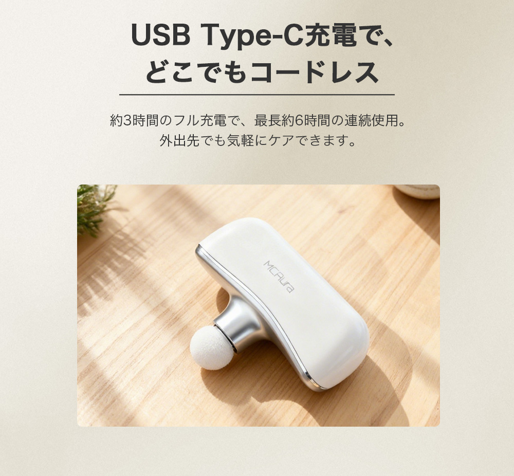 【製品仕様・保証・サポートについて】充電に関しては、必ず付属のケーブルの使用と充電器の出力にお気をつけ下さい。充電定格電源:DC 5V/1A。保証の対象は日本国内での使用に限ります。商品に不具合があった場合は、交換などはMCAuraサポートで早急にご対応させて頂きますので、説明書に記載している連絡先にご連絡下さい。 ●MCAura / MC8698 ミニハンディガン/ サイズ:約W125×D70×H42(mm) / 重量:約240g / セット内容:本体、Type-C充電用USBケーブル(充電用アダプタは付属なし)、取扱説明書(保証書付) / 充電時間:約3時間、動作時間:約6時間 / 原産国:中国 / 企画・販売元:MCホールディングス株式会社