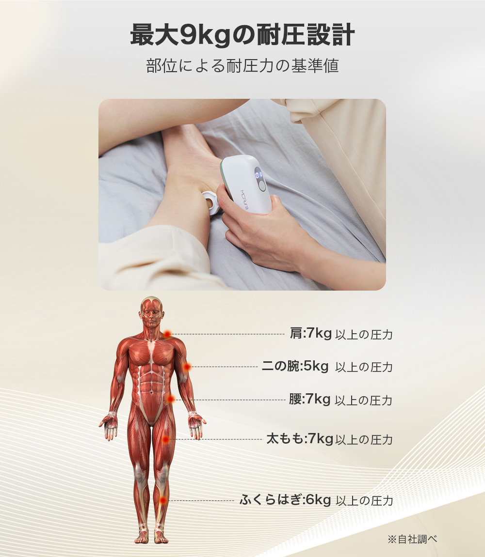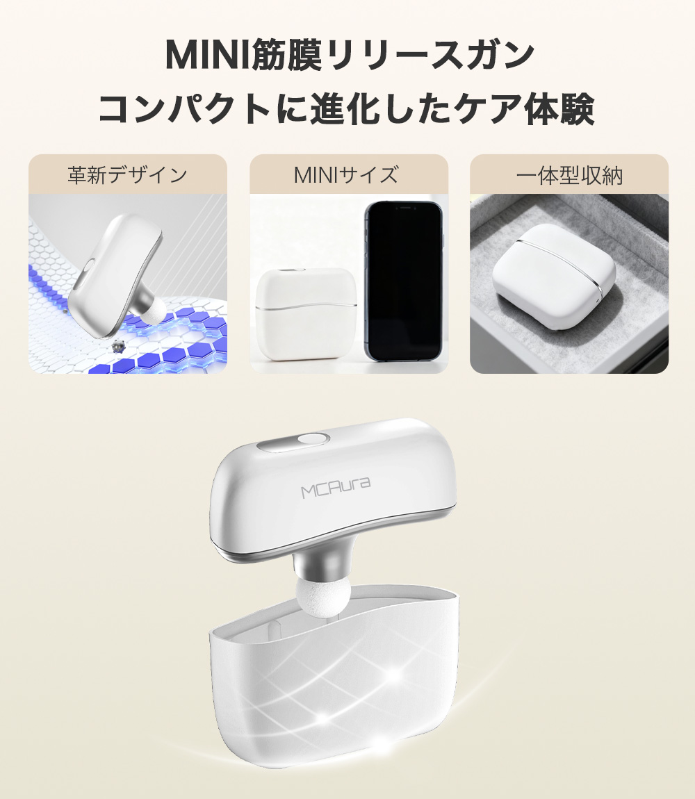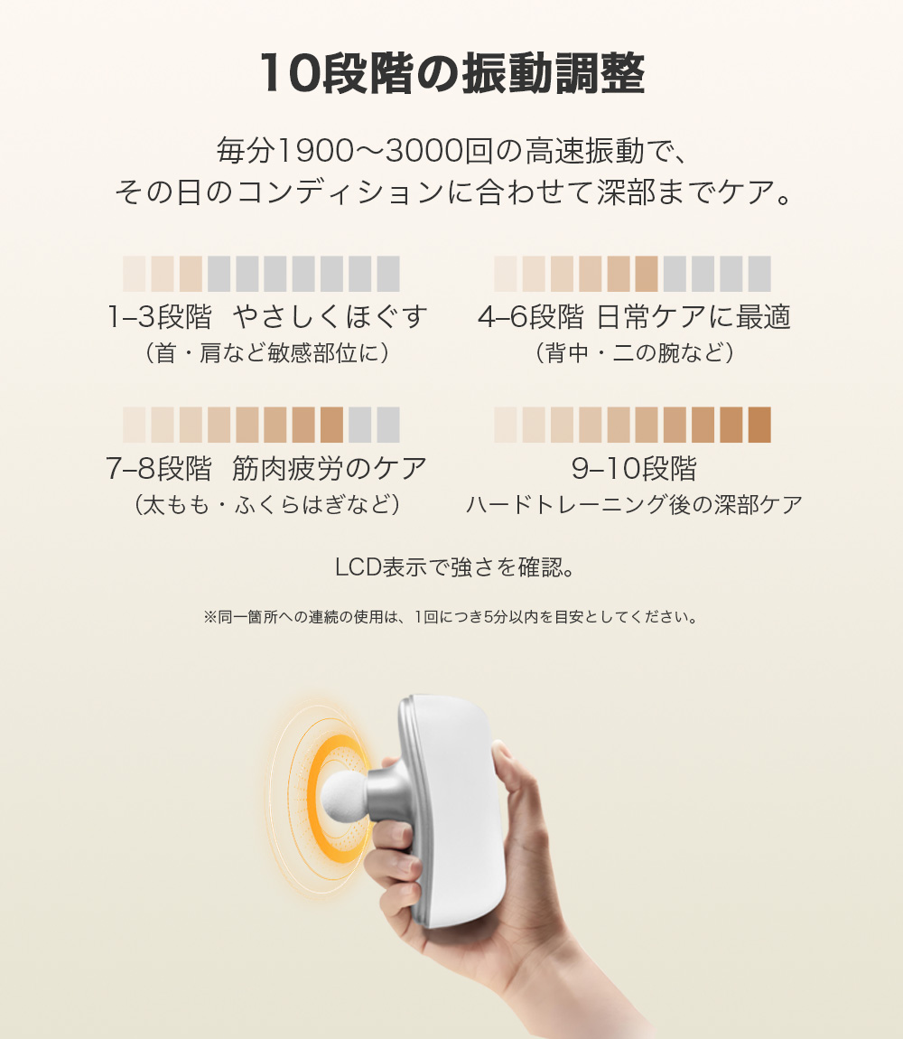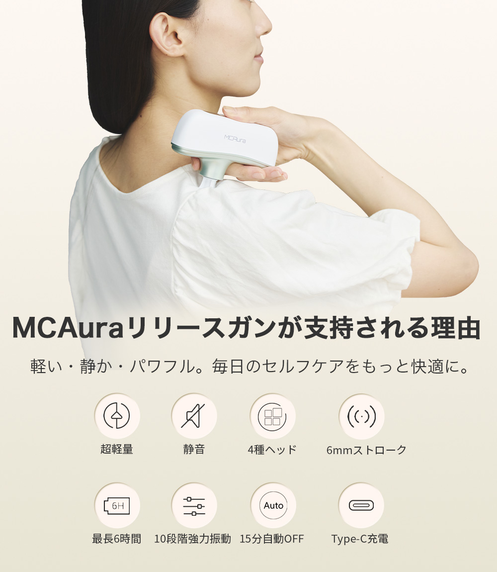 【ワンタッチで簡単操作&安心の安全設計】MCAura 筋膜リリースガンは操作が簡単で、ワンタッチで起動。10段階の振動スピードを搭載し、毎分1900~3000回の振動数をお好みに合わせて細かく調節できます。高精度のスマートセンサーが押圧の強さを感知し、自動で振動強度を調整するため、安心してお使いいただけます。低速はデリケートな部位に適し、高速は運動後の筋肉のリラックスに効果的。さまざまなシーンで幅広くご活用いただけます。軽量コンパクトな設計で、片手でも楽に操作可能。テレビ鑑賞や読書、休憩時間にも気軽に使えて快適です。さらに約15分で自動停止する安全機能を搭載し、初めての方も安心してご利用いただけます。