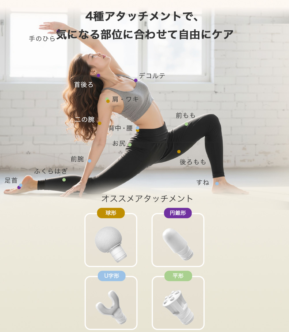 【 用途に応じて使い分ける4種類アタッチメント】半球形、円錐形、U字形、平形の4種ヘッド付き。背中や足裏、腕、フェイスラインなど部位に合わせて使い分けることで、プロのようなセルフケアを手軽に実現できる筋膜リリースです。