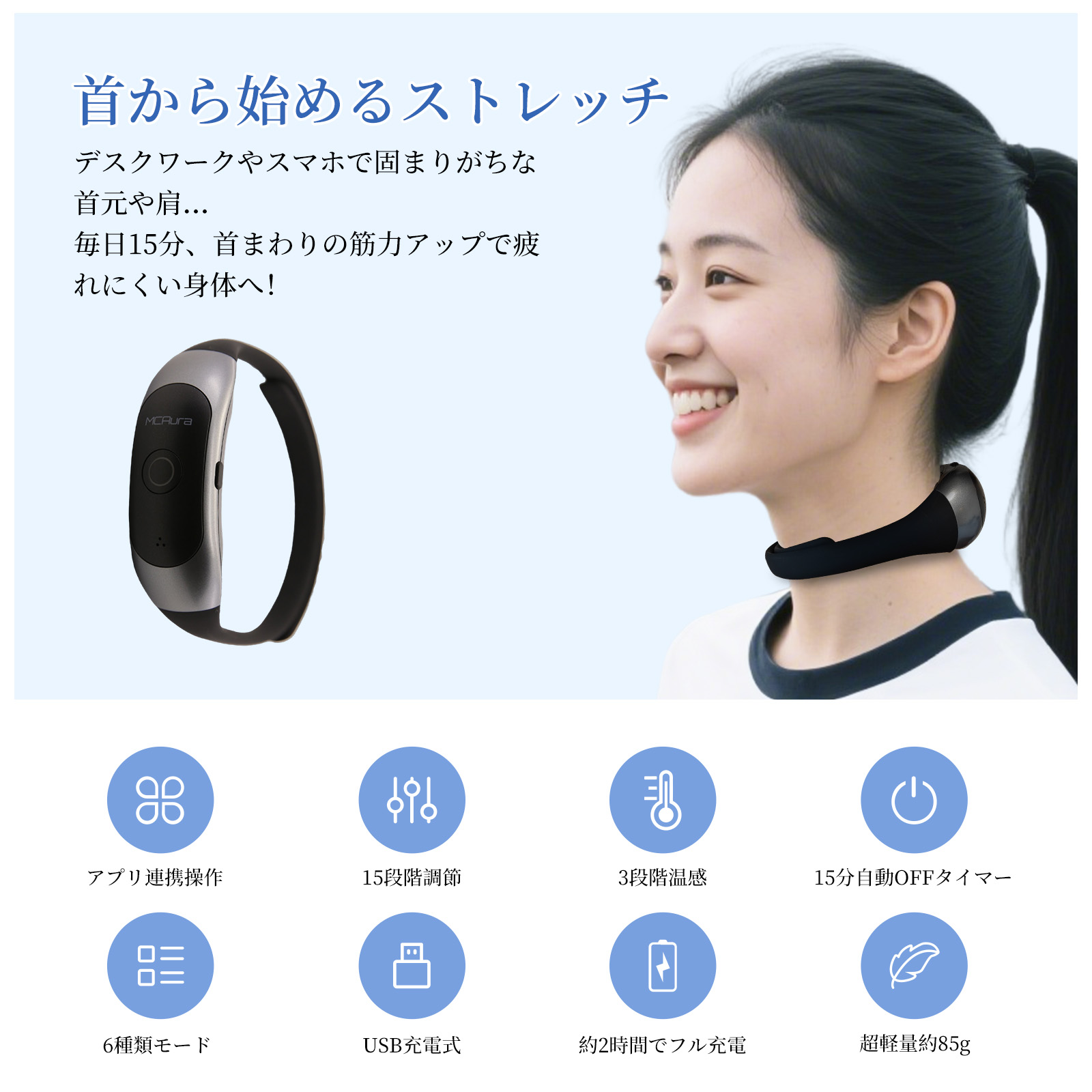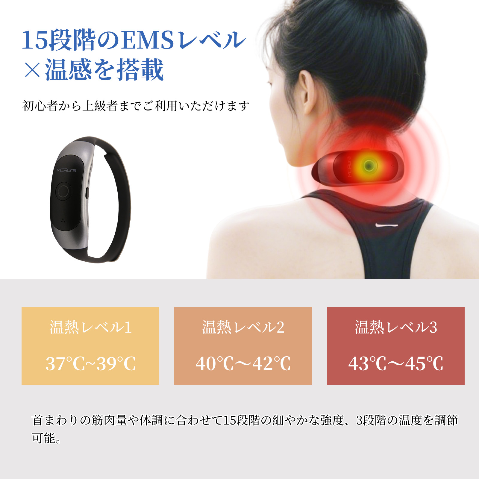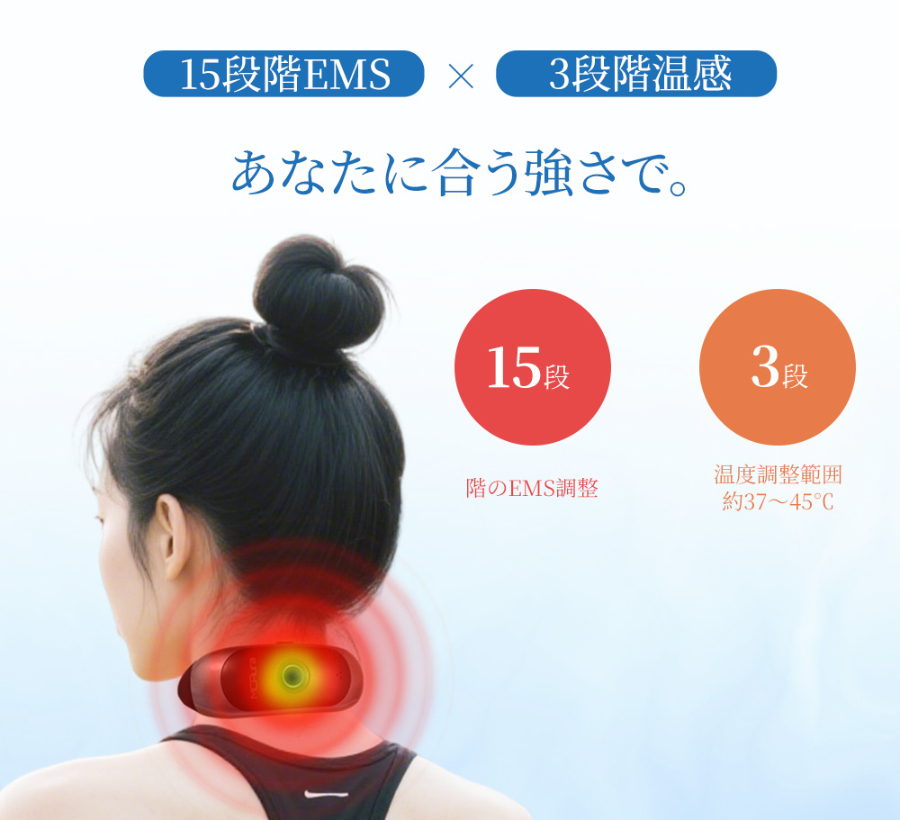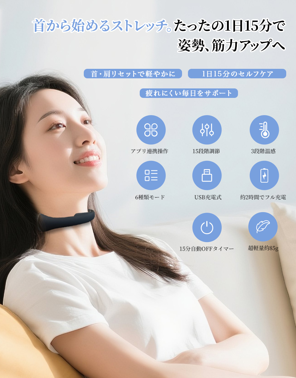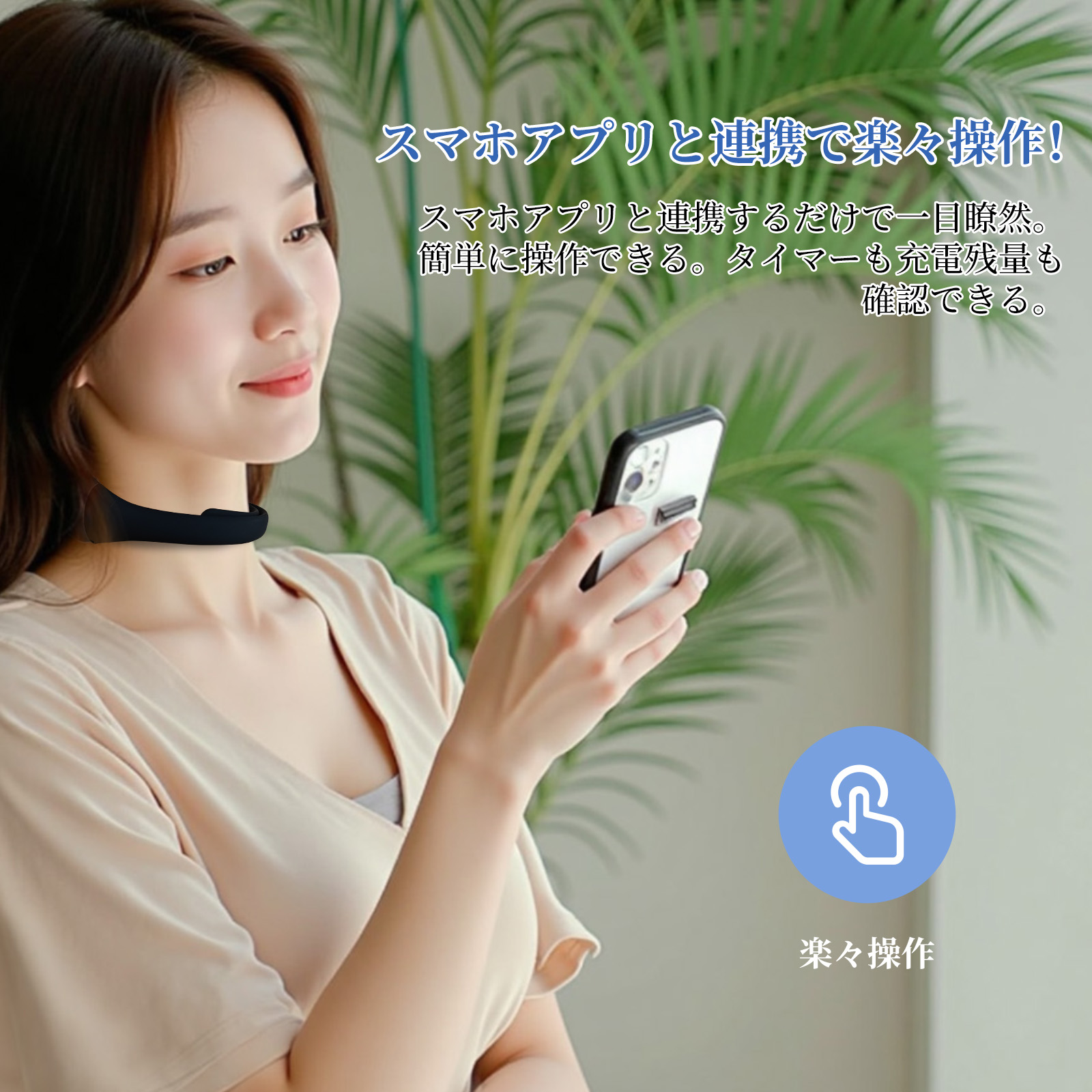 【15段階強度調節 × 温熱3段階 × 6種類モード】首と肩のケアのために設計されたリラクゼーション器です。EMS機能:15段階の強さ調整が可能。やさしい刺激からしっかりした刺激まで、自分に合ったレベルを選べます。リズムモード:6種類のバリエーション豊かな刺激で首や肩を心地よく刺激し、快適なセルフケアをサポート。温熱機能:37〜45℃の3段階調整。まるで蒸しタオルを当てているようなぬくもりで首元を包み込みます。ネックウォーマーとして、特に寒い季節に首元をやさしく温めるアイテムとして活躍します。EMS・リズム・温熱を自由に組み合わせて、その日の気分やシーンに合わせたケアが可能。就寝前のひとときや在宅ワークの合間など、さまざまな場面で首元のリフレッシュをお楽しみいただけます。※初めてご使用の際は、レベル1からお試しください。