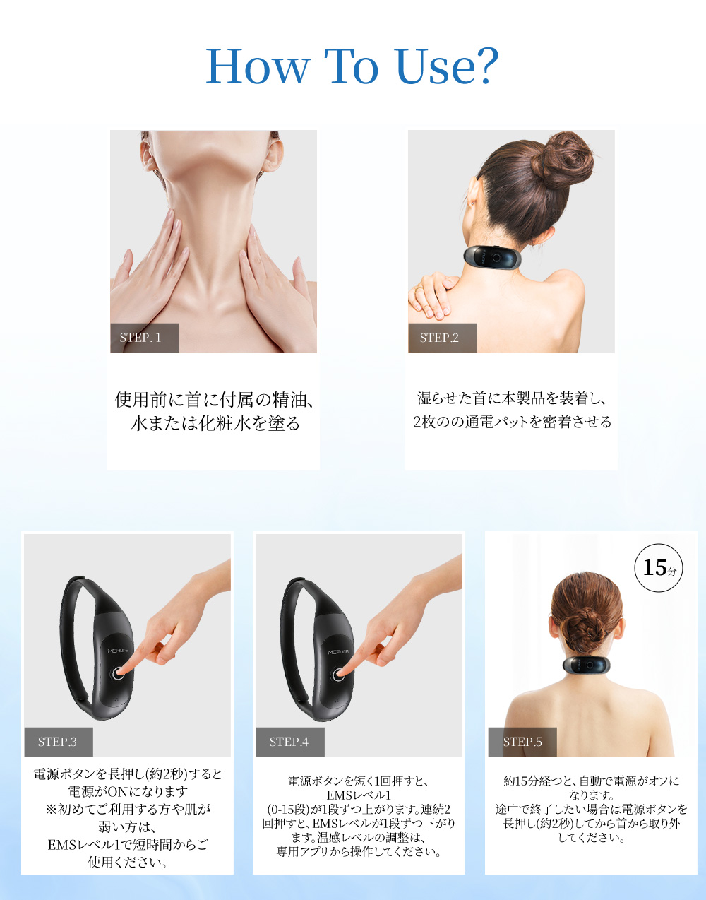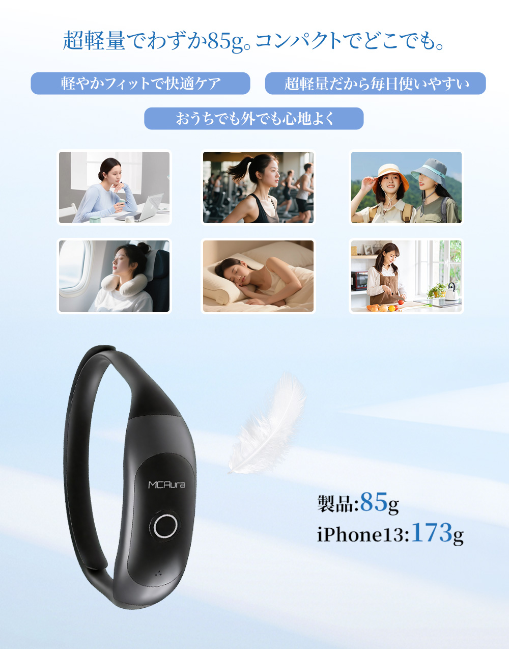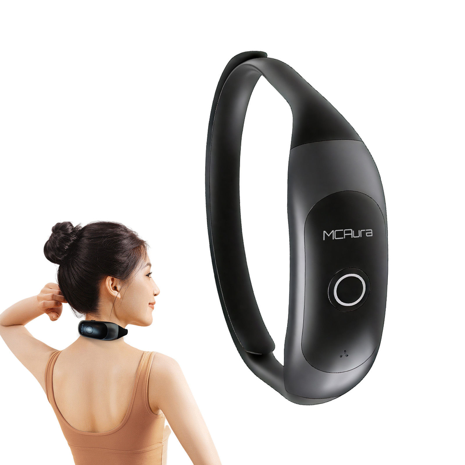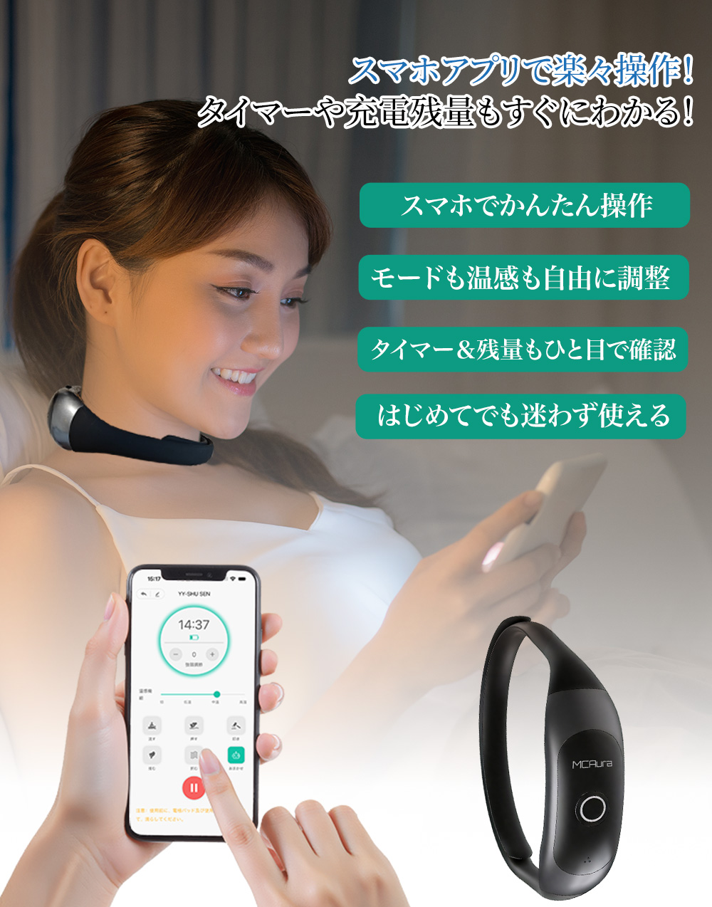 【新登場 × アプリ連動ネックケア】MCAura最新モデルのネックリラクゼーション機器は、専用アプリで直感的に操作可能。人間工学に基づいたデザインと肌にやさしい素材、さらに約85gの超軽量ボディと静音設計で、快適な装着感と持ち運びやすさを両立しました。自宅でも外出先でも、手軽に首元のリフレッシュを楽しめます。EMS刺激と温熱機能を組み合わせ、やさしく包み込まれるような心地よさをお届けします。※【ご使用上の注意】使用前に付属の美容オイルまたは水・化粧水で肌を軽く湿らせてください。乾いた状態ではEMSの刺激が伝わりにくく、不快に感じることがあります。