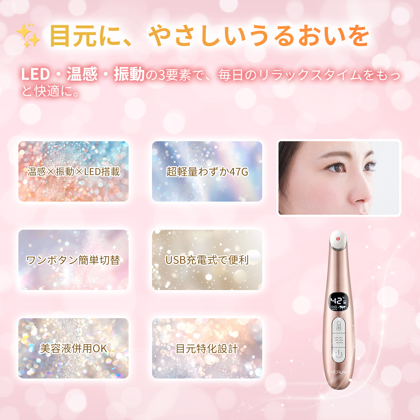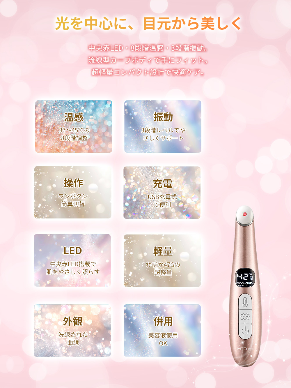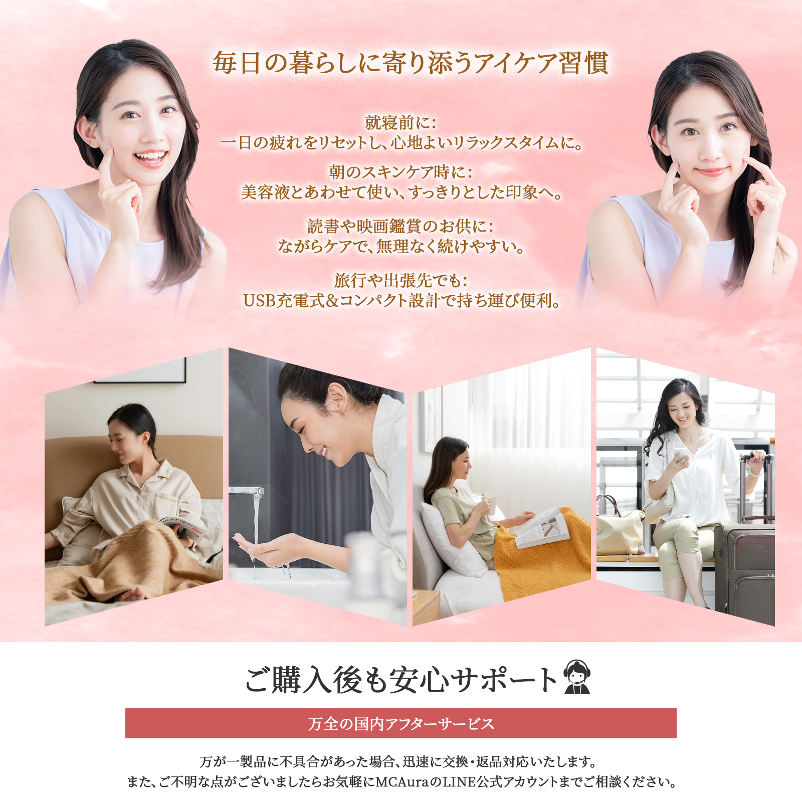 ✅【製品仕様・保証・サポートについて】 ⚙ 製品仕様 製品名:MCAura / E y e R a y F i t 目元美顔器_MC2513 サイズ:約 W139×D29×H28.5mm 重量:約47g セット内容:本体、Type-C充電用USBケーブル(※充電アダプタは付属しません)、取扱説明書(保証書付) 充電時間:約3時間 動作時間:約1.5時間(※目安。使用状況により異なります) 企画・販売元:MCホールディングス株式会社 ???? 充電について 必ず付属のUSBケーブルをご使用ください。 定格電源:DC 5V / 1A ???? 保証・サポート 保証の対象は 日本国内での使用に限ります。 商品に不具合があった場合は、取扱説明書に記載の MCAuraサポート窓口 へご連絡ください。 美顔器の単品購入にはガイドブックは付属しません。