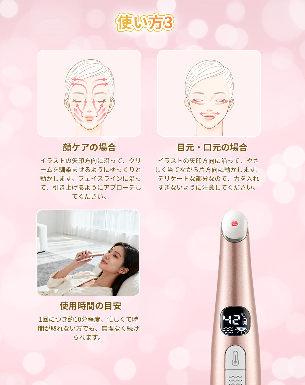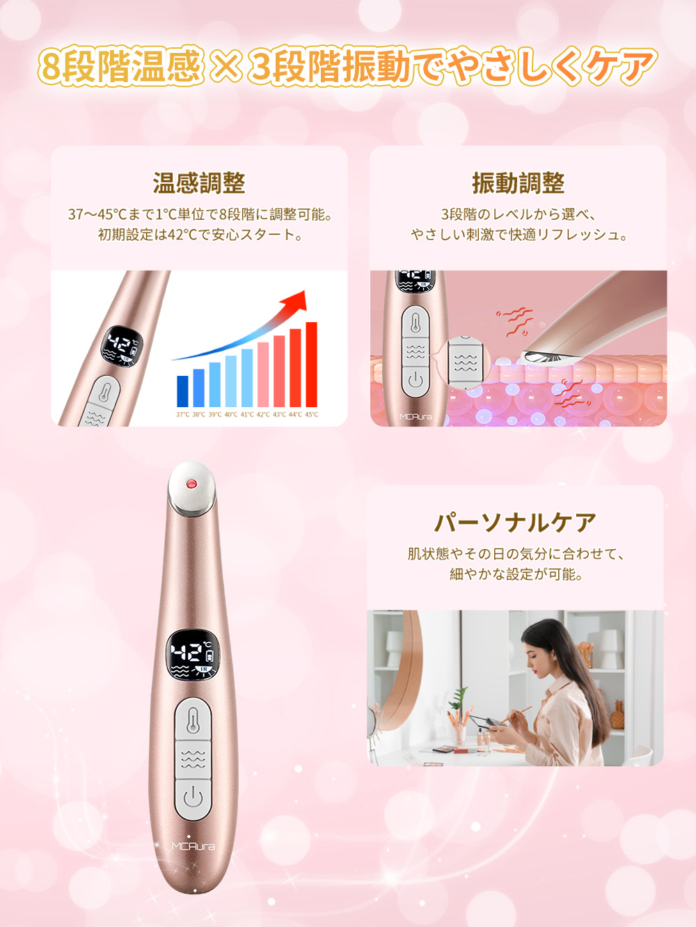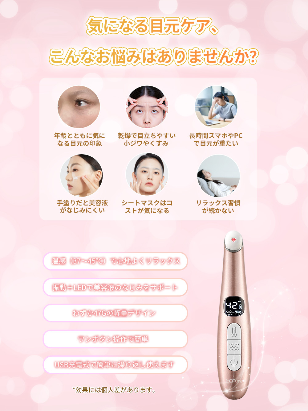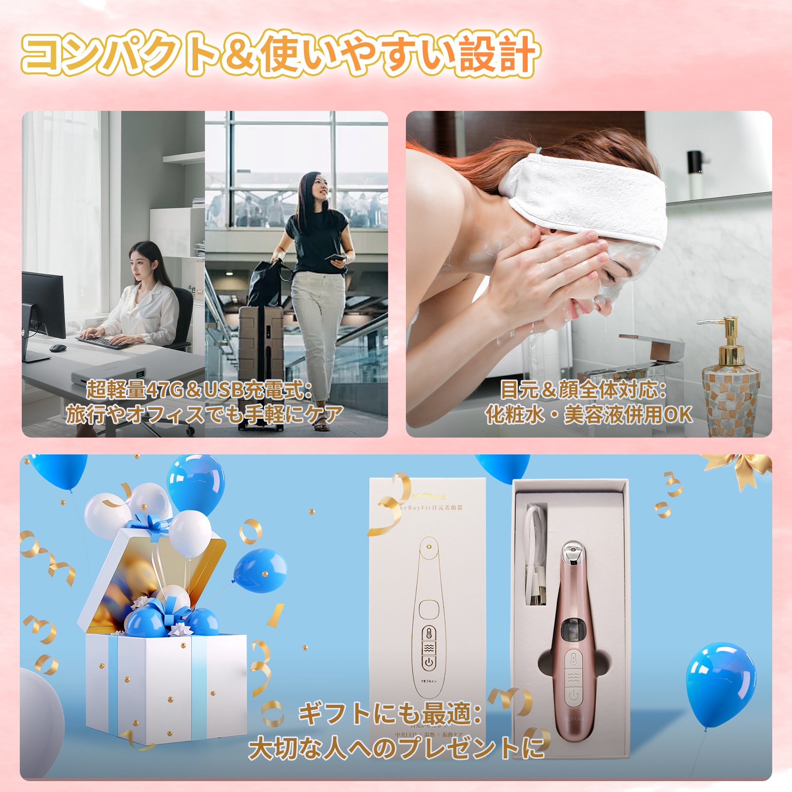 ✅【製品仕様・保証・サポートについて】 ⚙ 製品仕様 製品名:MCAura / E y e R a y F i t 目元美顔器_MC2513 サイズ:約 W139×D29×H28.5mm 重量:約47g セット内容:本体、Type-C充電用USBケーブル(※充電アダプタは付属しません)、取扱説明書(保証書付) 充電時間:約3時間 動作時間:約1.5時間(※目安。使用状況により異なります) 企画・販売元:MCホールディングス株式会社 ???? 充電について 必ず付属のUSBケーブルをご使用ください。 定格電源:DC 5V / 1A ???? 保証・サポート 保証の対象は 日本国内での使用に限ります。 商品に不具合があった場合は、取扱説明書に記載の MCAuraサポート窓口 へご連絡ください。 美顔器の単品購入にはガイドブックは付属しません。