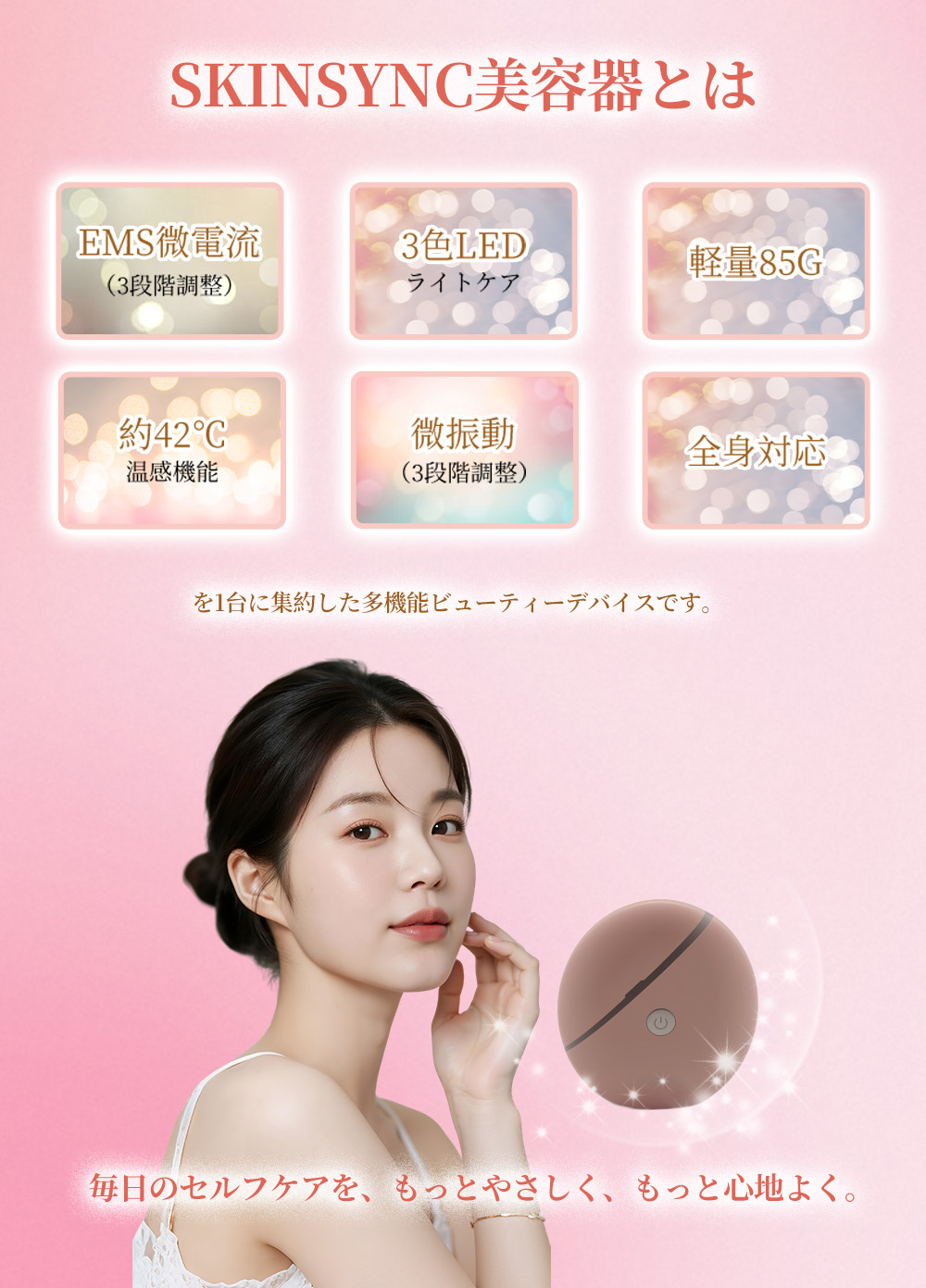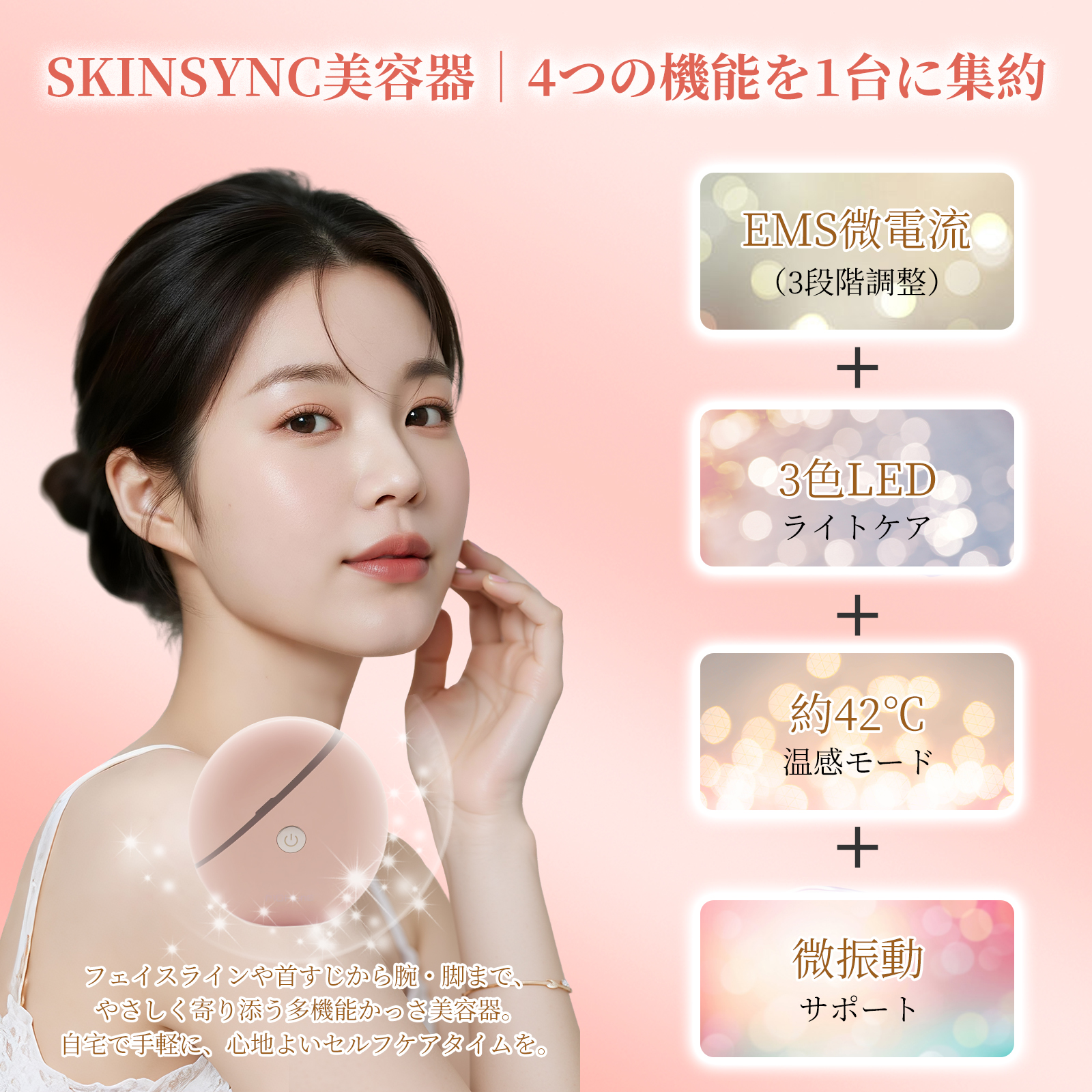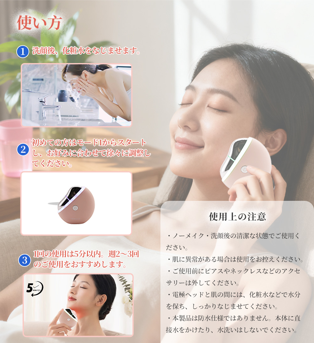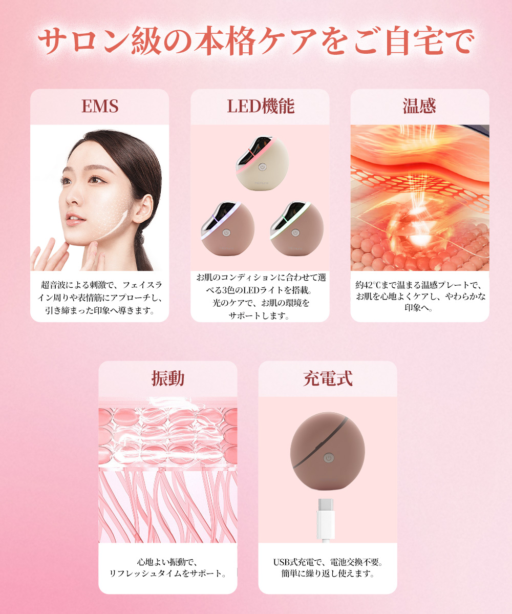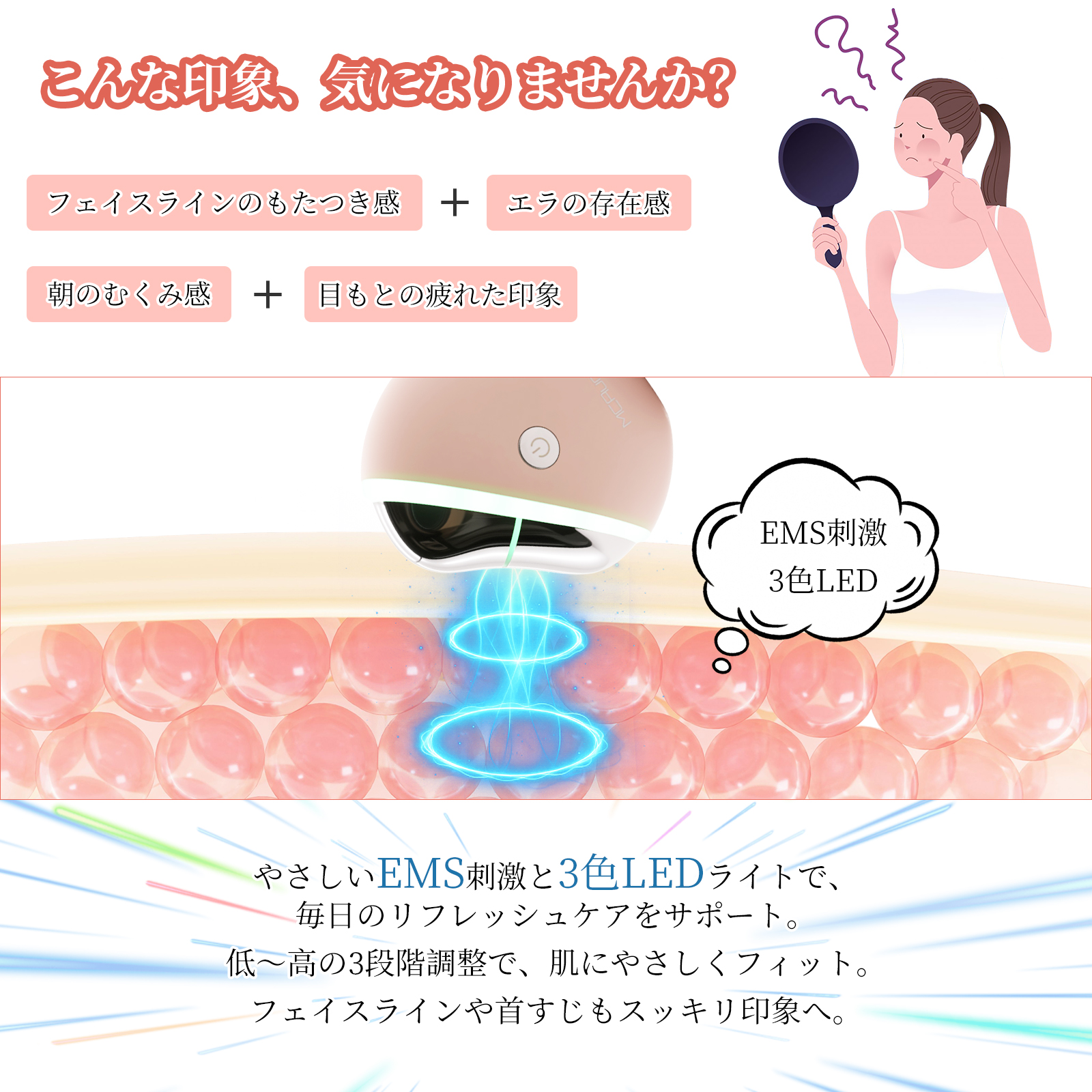 ✅【4つの美容ケア機能を1台に集約】 ???? EMS微電流(3段階調整):やさしい刺激が表情筋やフェイスラインに心地よくフィット。 ???? 微振動ケア:化粧水や美容液をなじませやすく、日々のスキンケアをサポート。 ???? 約42℃温感ケア:やわらかな温かさが肌を包み込み、心地よいリラックスタイムを演出。 ???? 3色LEDライトケア:青・緑・赤の光を気分や肌の状態に合わせて切替可能。 これ1台で多彩なケアを叶える家庭用かっさ美顔器。毎日のセルフケアをもっと快適に。