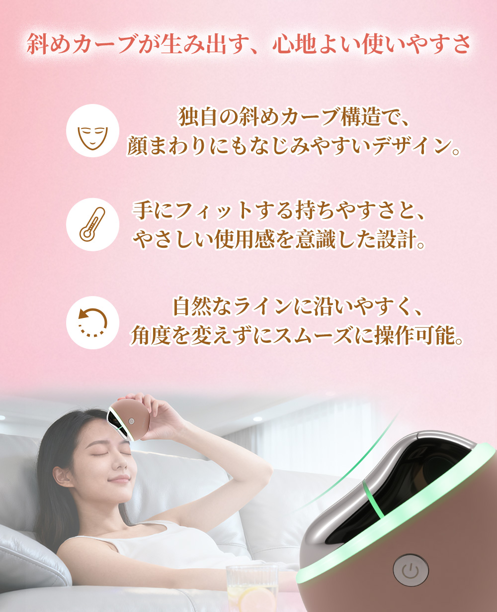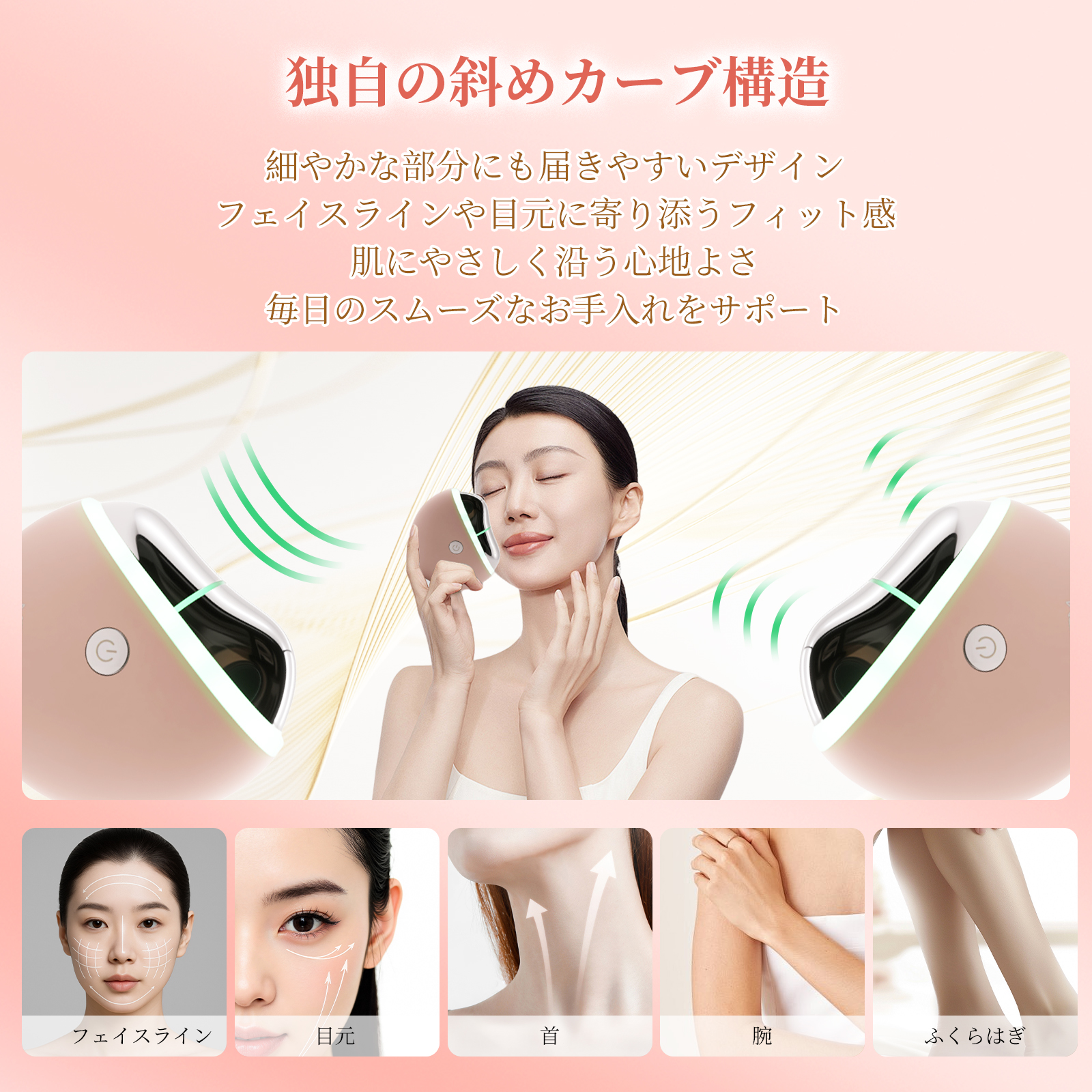 ✅【半月型カーブデザイン&快適フィット】 手のひらに自然にフィットする半月型デザインで、顔や首筋のラインに沿いやすく、小鼻や口元など細やかな部分にもアプローチ可能。 角型部分はピンポイントケアに、丸型部分は広い面でのスライドケアに、エッジ部分は軽いツボ押しにも活躍。 従来のローラー式や平板プレートでは届きにくい部位も、このEMSかっさ美顔器ならやさしくサポートします。フェイスから首・デコルテ、肩・腕・脚・背中まで全身に対応。