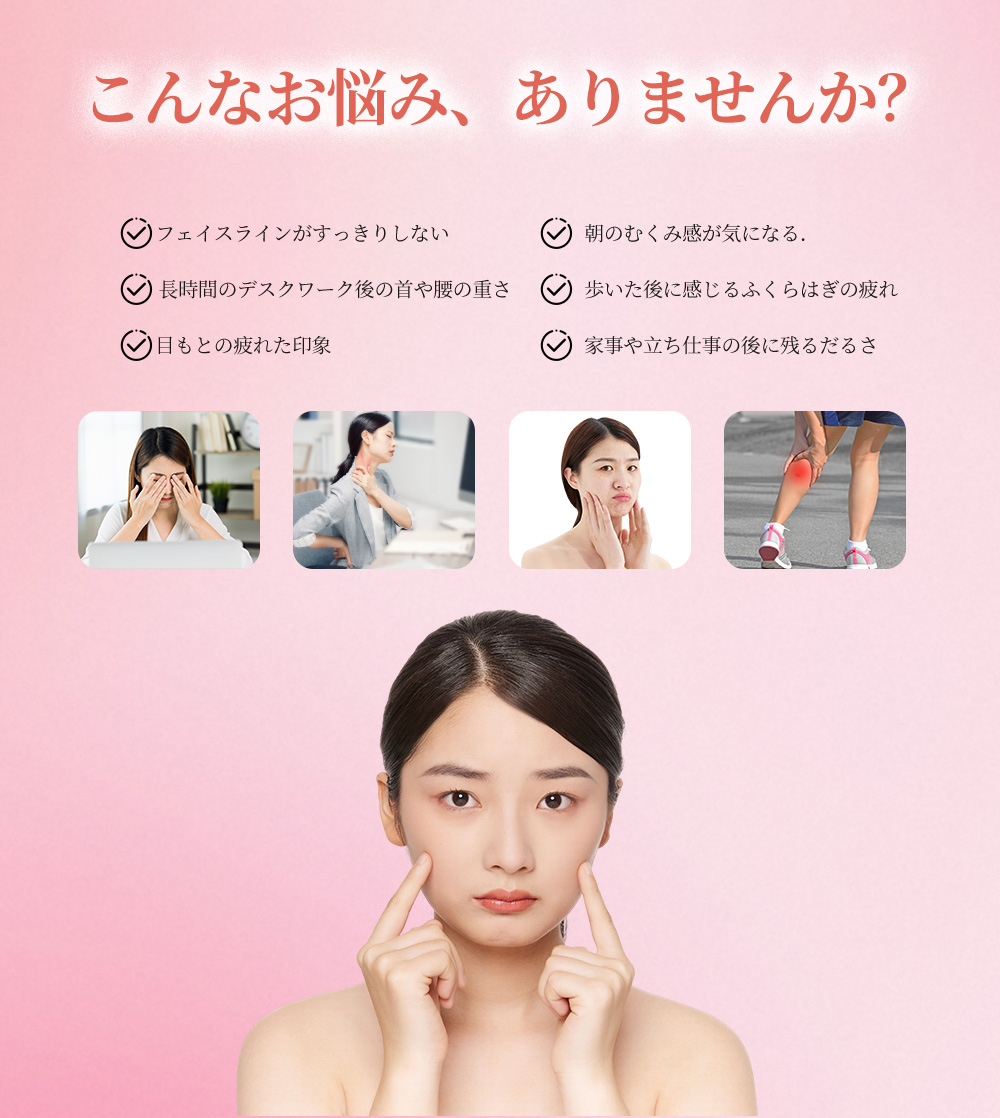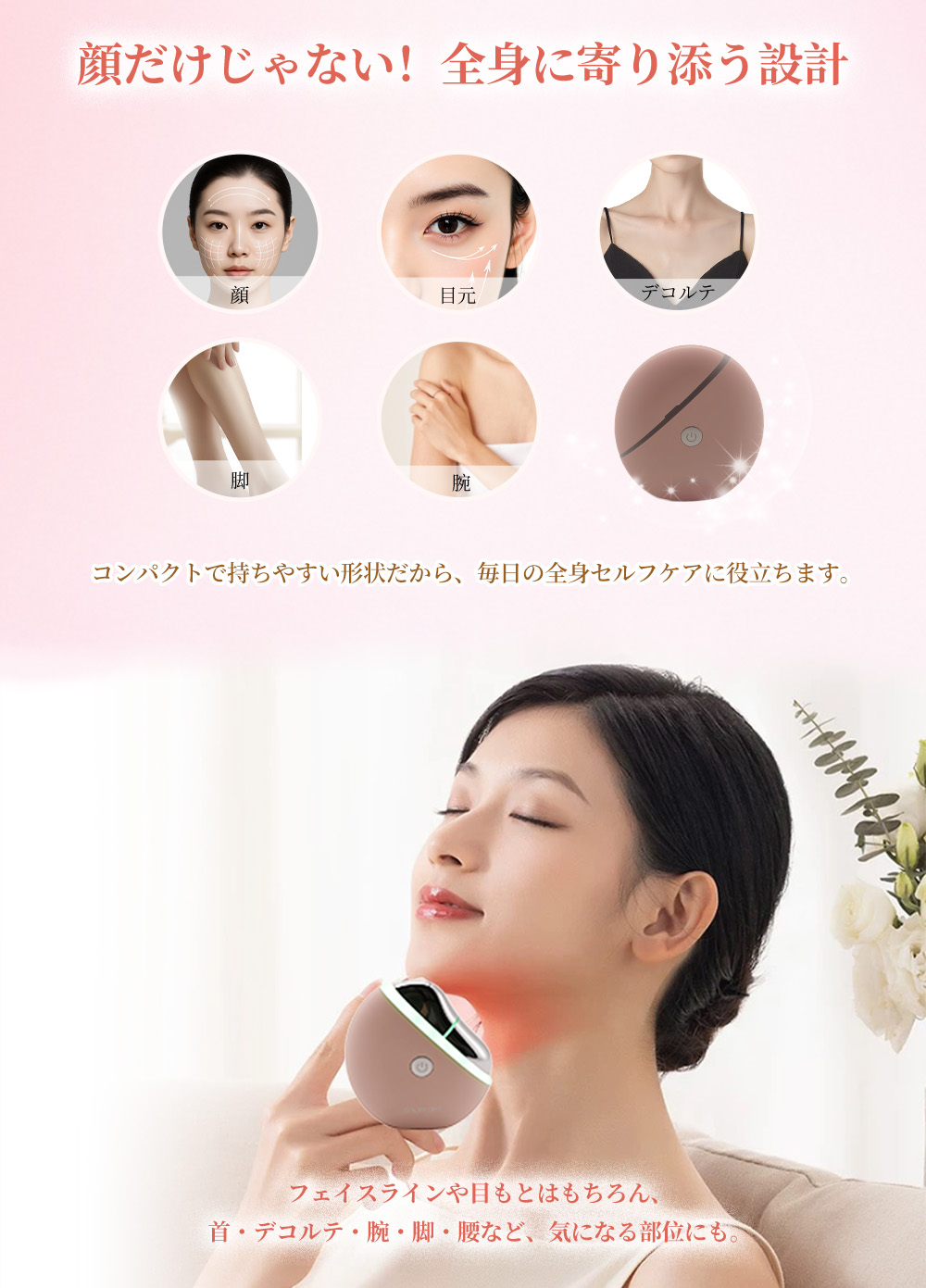 ✅【顔も身体もケアできるかっさ美顔器】 年齢を重ねるにつれて気になるフェイスラインや首元のゆるみ。さらにスマホやパソコンを長時間見続けることで、目元や肩まわりの疲れを感じる方も少なくありません。 そんな日々のお悩みに寄り添うのが、この電動かっさ美顔器。EMS微電流・微振動・約42℃温感・3色LEDを1台に集約し、フェイスケアからボディケアまで幅広くサポートします。 洗顔後のスキンケアタイムやお風呂上がりのリラックス時間、就寝前や在宅ワークの合間、旅行先でも手軽に使用可能。 ※本製品は防水仕様ではありません。必ず乾いた状態でご使用ください。