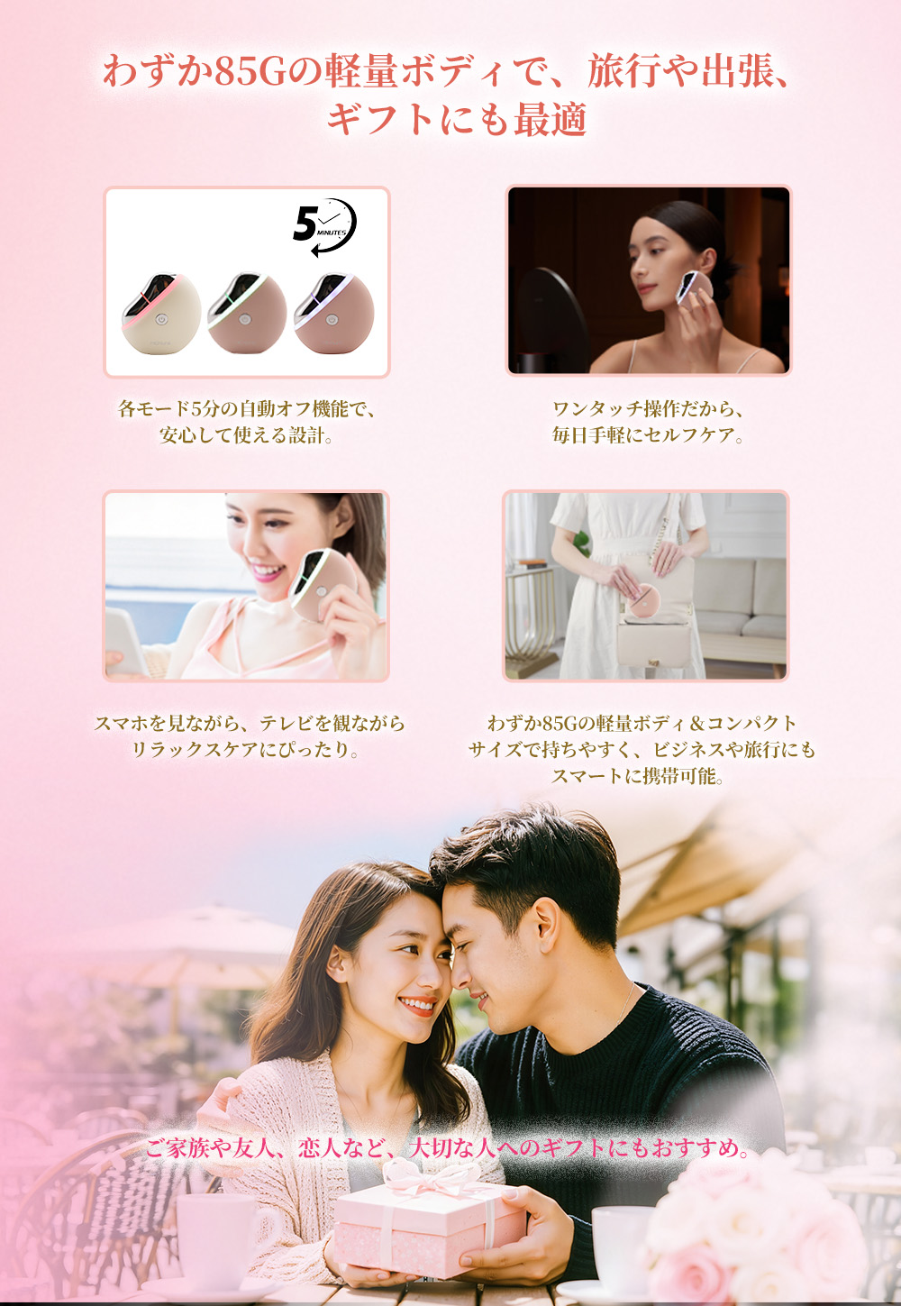 ✅【軽量85g&ギフトにも最適】 本体はわずか約85gと軽量で、長時間使用しても手に負担がかかりにくい設計。 シンプルで上品なデザインは、年齢や性別を問わず幅広い世代に喜ばれます。母の日・誕生日・敬老の日・クリスマスなど、大切な方への贈り物にもぴったり。 専用ギフトボックス付きで、そのままお渡しできるのも安心。ご家族やご友人へのプレゼントはもちろん、ご自分へのご褒美としても最適なかっさ美顔器です。