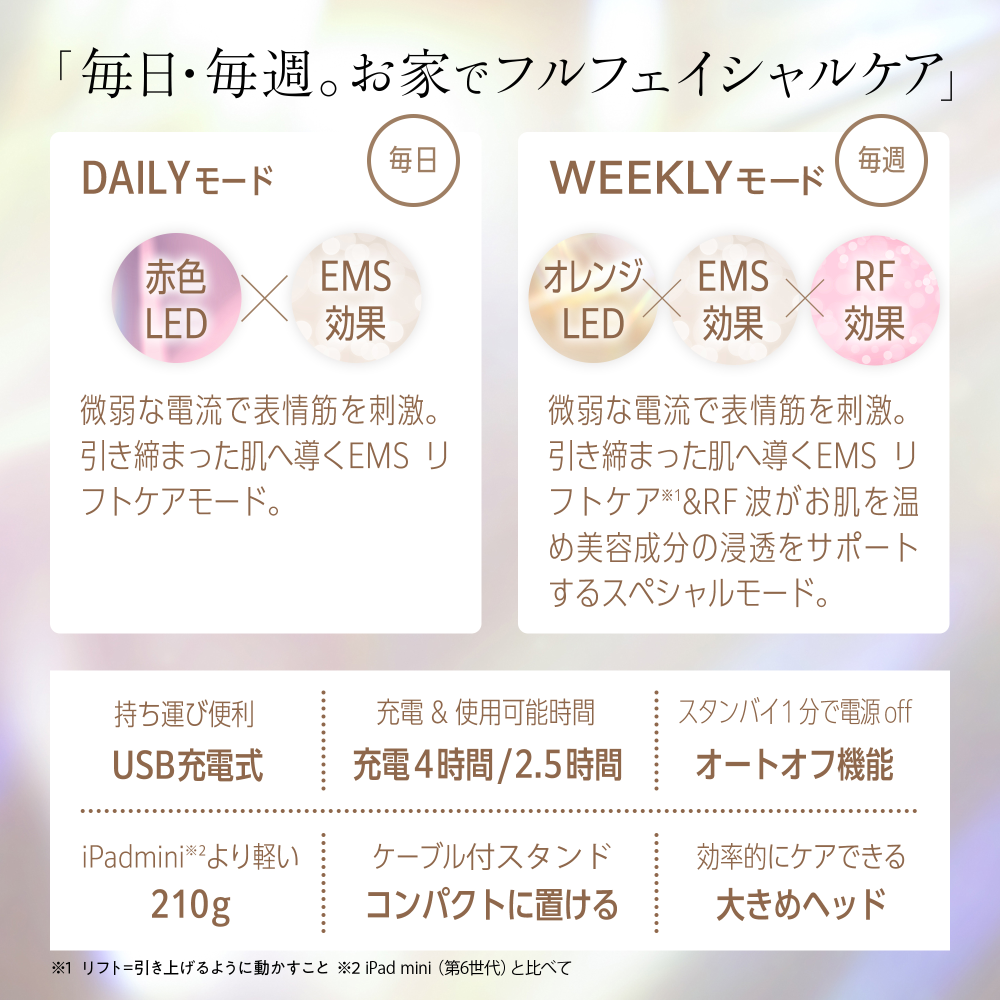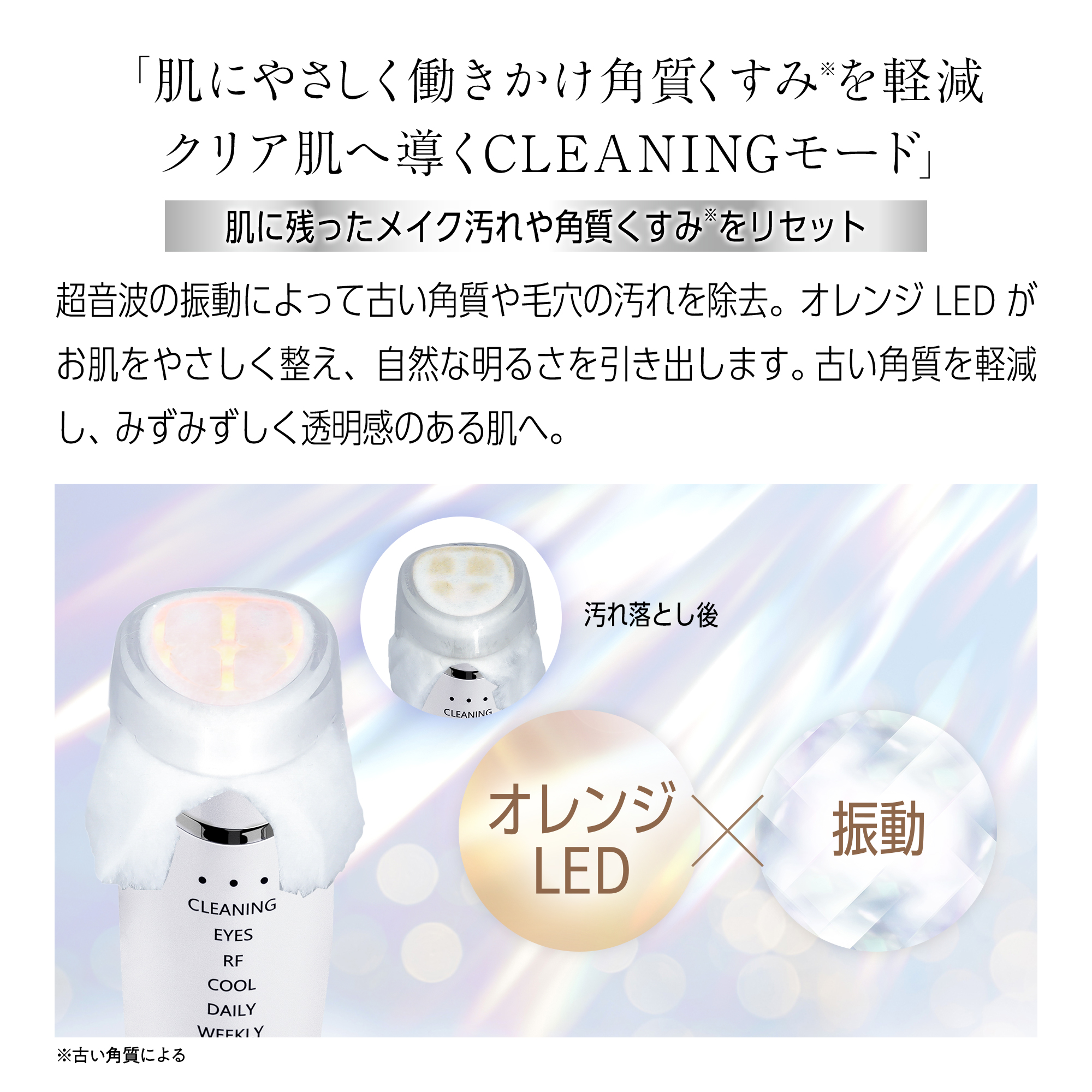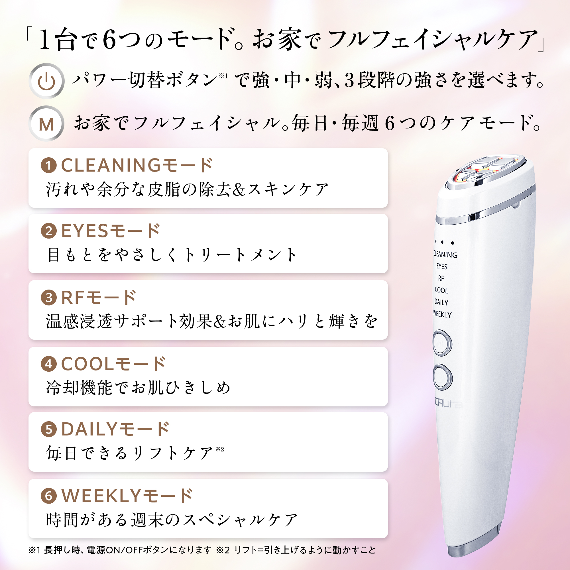 ✅ 【6モード搭載|肌悩みに合わせたケア】本製品の多機能美顔器は、肌悩みに応じて使い分けできる6つのモードを搭載。毛穴ケアからフェイスライン、目元や口元まで幅広くサポートします。EYESモード:EMS微電流がデリケートな目元をやさしくケア。アイクリームの浸透を助け、ハリのある目元印象をサポート。RFモード:温感(約45℃)で肌をじんわり温め、フェイスラインや口元のケアに。美容液のお手入れを後押しします。COOLモード:11〜15℃の冷感とブルーLEDで肌をリフレッシュ。毛穴を引き締め、化粧ノリの良い肌印象へ。DAILYモード:EMS×振動×LEDで毎日のベーシックケア。肌を引き締め、ハリと弾力感のある印象をサポート。WEEKLYモード:EMS・RF・LEDを組み合わせた集中ケア。週1回のお手入れで肌を整え、明るい印象へ導きます。さらに、各モードには自動停止タイマーを搭載し、使いすぎを防止。感触センサーにより肌に触れた時だけ動作するため、誤作動の心配もなく安心して使える家庭用美顔器です。