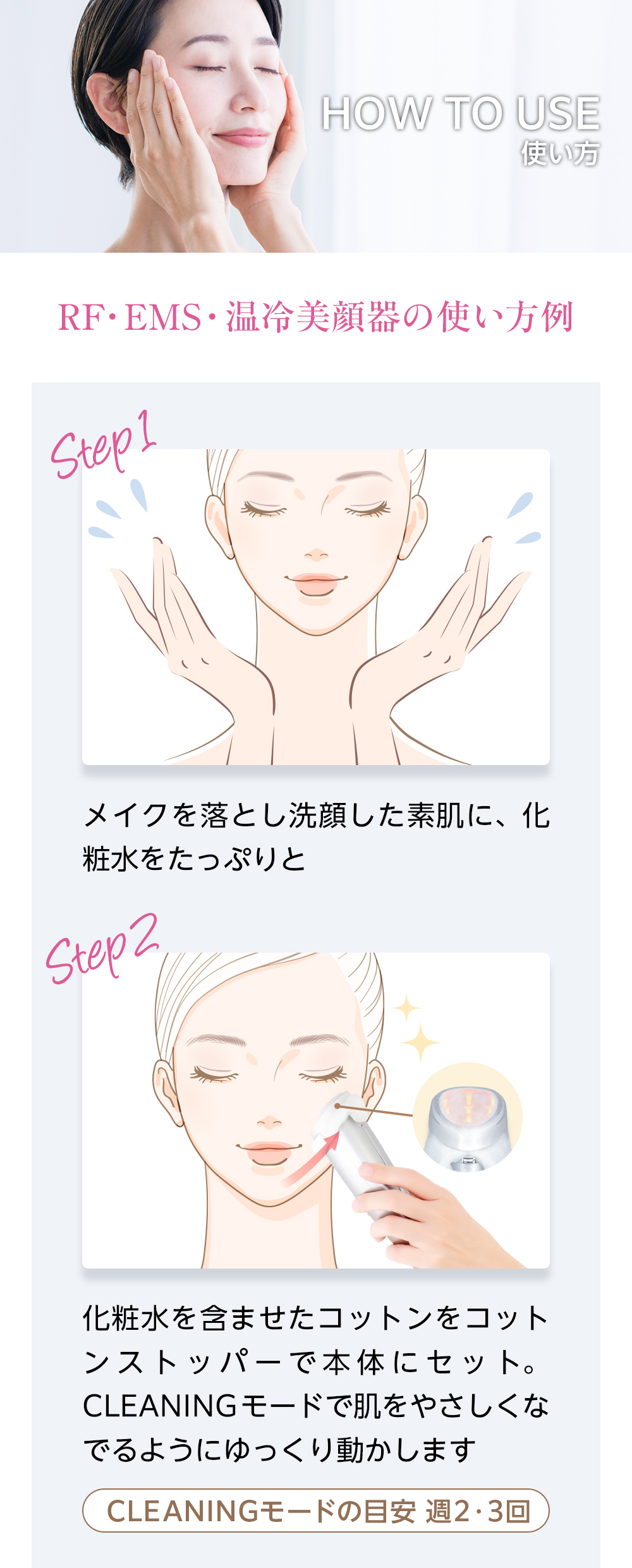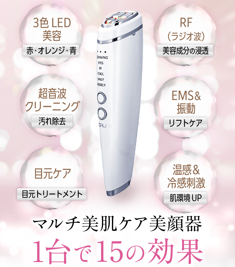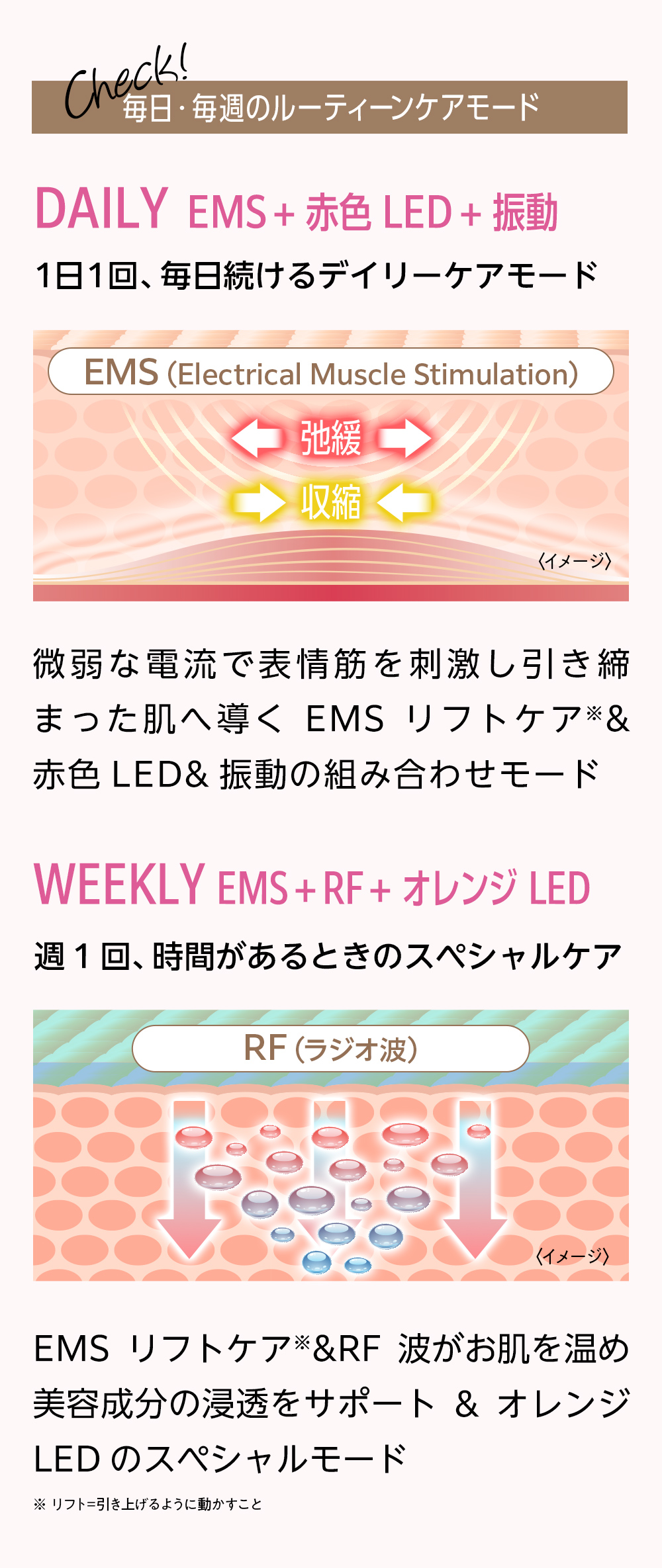 ✅ 【6モード搭載|肌悩みに合わせたケア】本製品の多機能美顔器は、肌悩みに応じて使い分けできる6つのモードを搭載。毛穴ケアからフェイスライン、目元や口元まで幅広くサポートします。EYESモード:EMS微電流がデリケートな目元をやさしくケア。アイクリームの浸透を助け、ハリのある目元印象をサポート。RFモード:温感(約45℃)で肌をじんわり温め、フェイスラインや口元のケアに。美容液のお手入れを後押しします。COOLモード:11〜15℃の冷感とブルーLEDで肌をリフレッシュ。毛穴を引き締め、化粧ノリの良い肌印象へ。DAILYモード:EMS×振動×LEDで毎日のベーシックケア。肌を引き締め、ハリと弾力感のある印象をサポート。WEEKLYモード:EMS・RF・LEDを組み合わせた集中ケア。週1回のお手入れで肌を整え、明るい印象へ導きます。さらに、各モードには自動停止タイマーを搭載し、使いすぎを防止。感触センサーにより肌に触れた時だけ動作するため、誤作動の心配もなく安心して使える家庭用美顔器です。