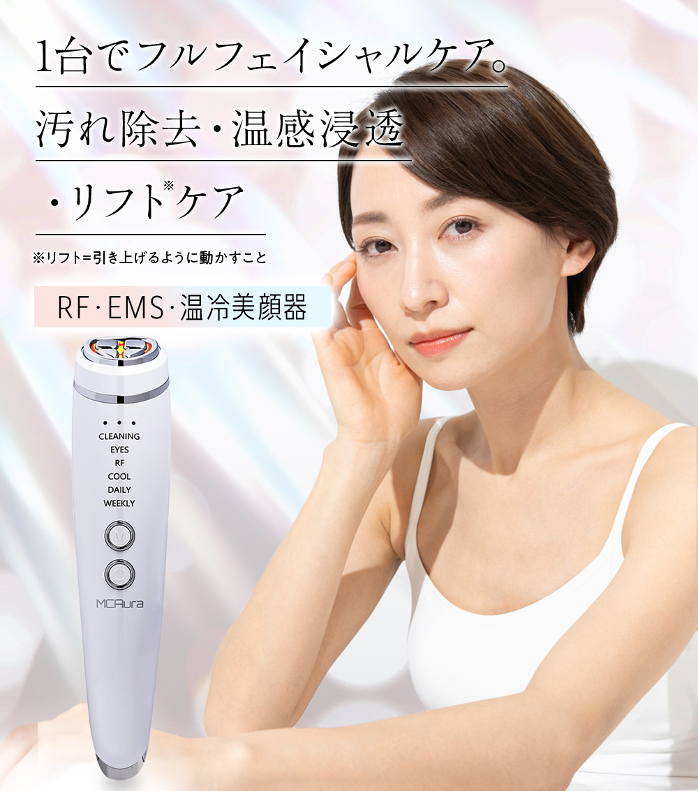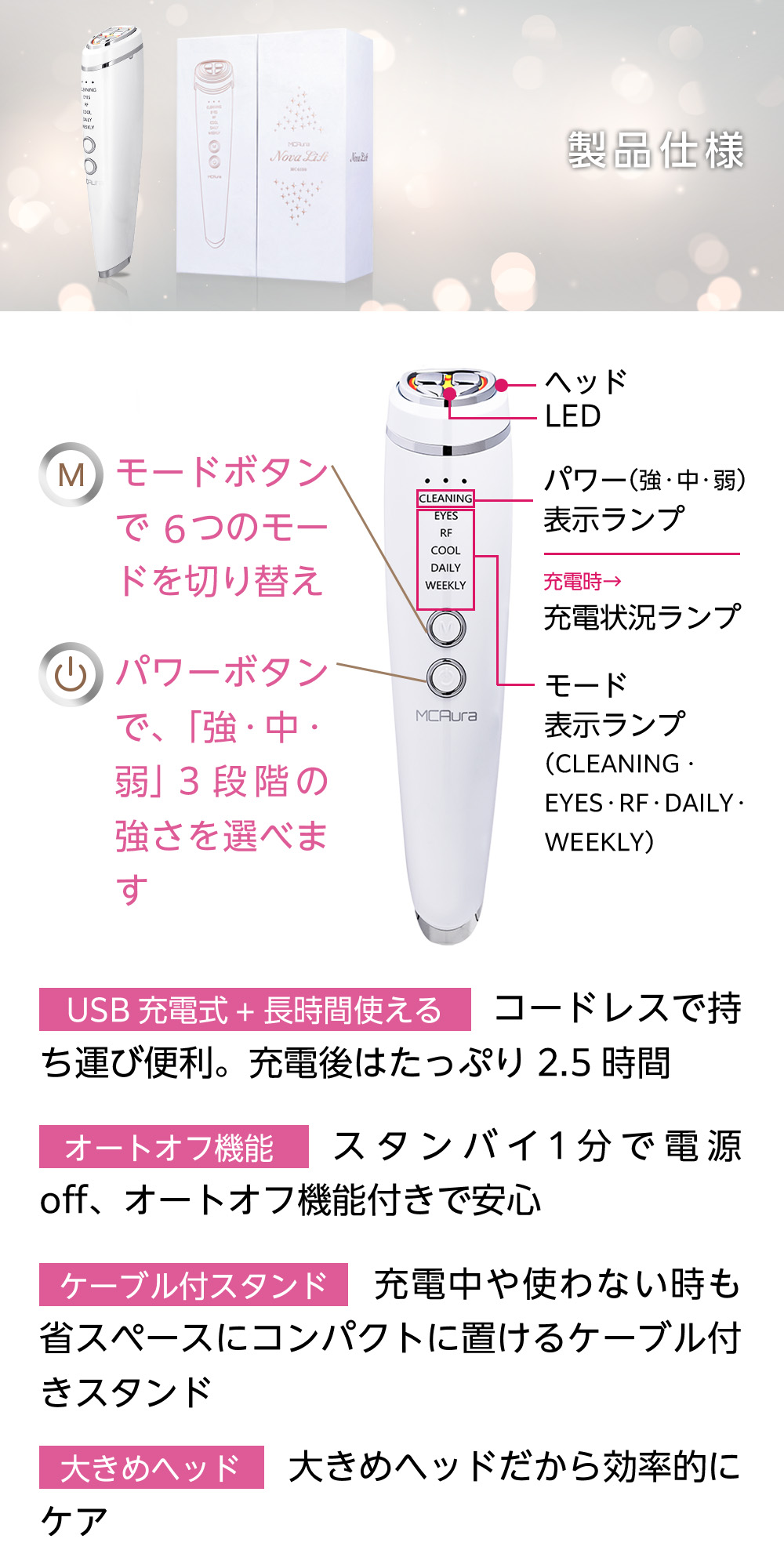 ✅【製品仕様・保証・サポートについて】 充電は必ず付属のケーブルをご使用ください。充電器は DC5V/1.0A 出力のものをご利用ください。保証は日本国内での使用に限ります。商品に不具合があった場合は、取扱説明書記載の連絡先より MCAuraサポート へご連絡ください。迅速に対応いたします。 ●製品名:MC6180_多機能温冷美顔器 ●サイズ:約W139×D29×H28.5(mm) ●重量:約200g ●セット内容:本体、USBケーブル付き磁気充電スタンド(※充電用アダプタは付属しません)、取扱説明書(保証書付き)、本体専用収納ポーチ。 ●充電時間:約4時間 ●動作時間:約2.5時間 ●原産国:中国 ●企画・販売元:MCホールディングス株式会社