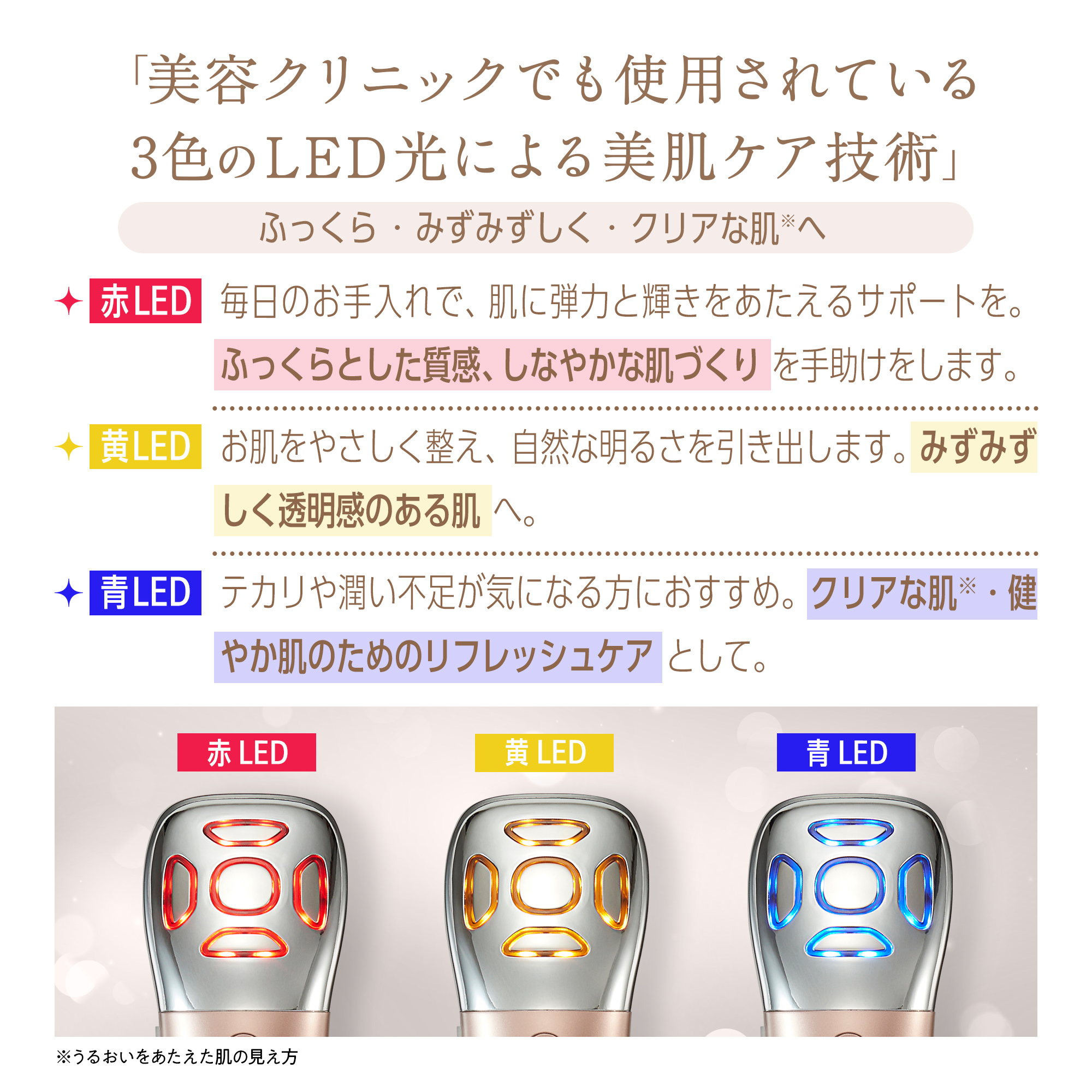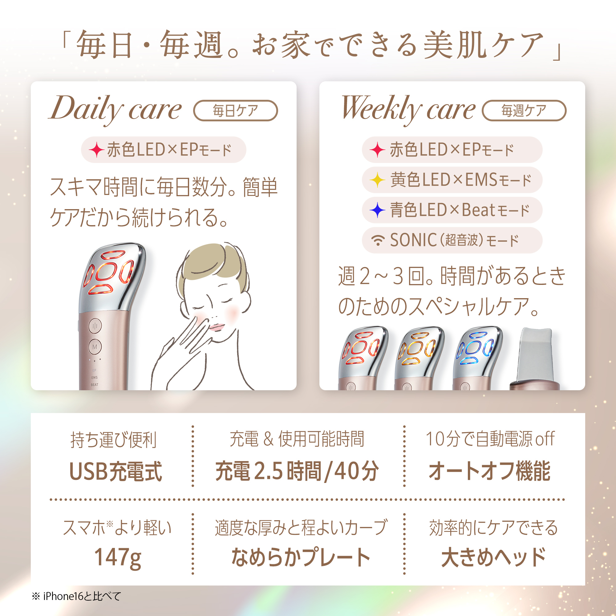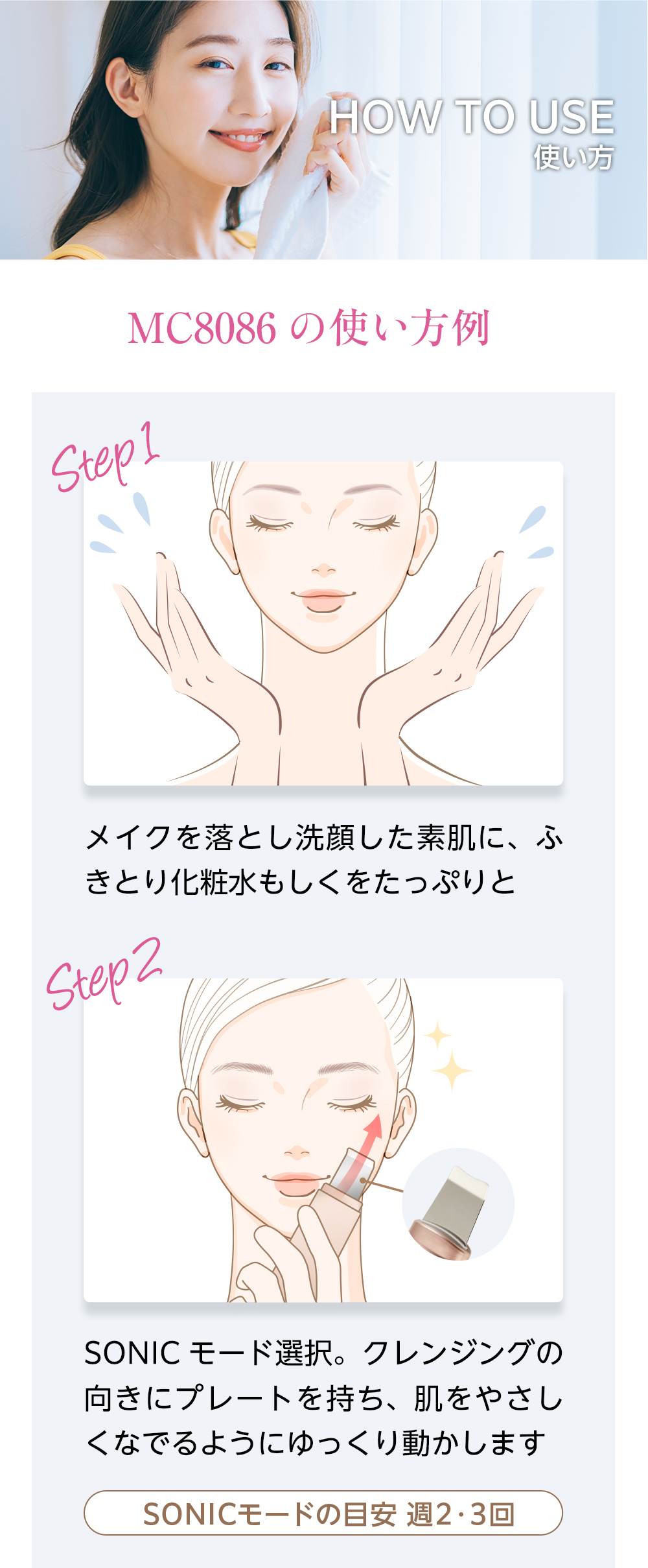 洗顔後、化粧水や美容液を塗布し、肌を整えます。本体の電源を入れ、お好みのモードを選択したら、ヘッド部分を肌に優しく当て、下から上へゆっくりと動かします。リフトアップを意識しながら、5~10分ほどケアを行い、終了後は保湿をしっかり行ってください。使用後は美顔器のヘッドを清潔に拭き取り、1日1回の使用を目安にご利用ください。