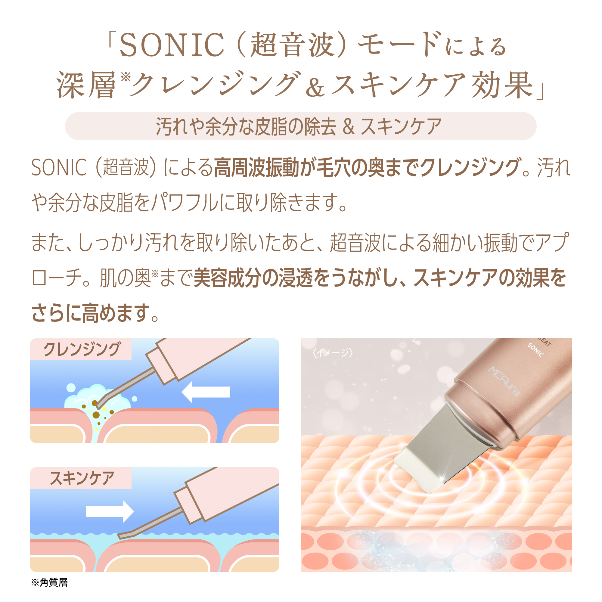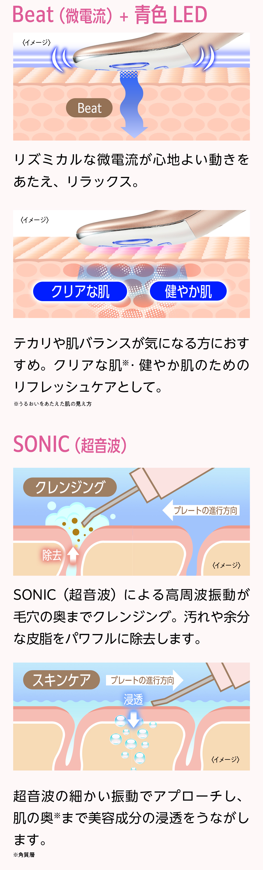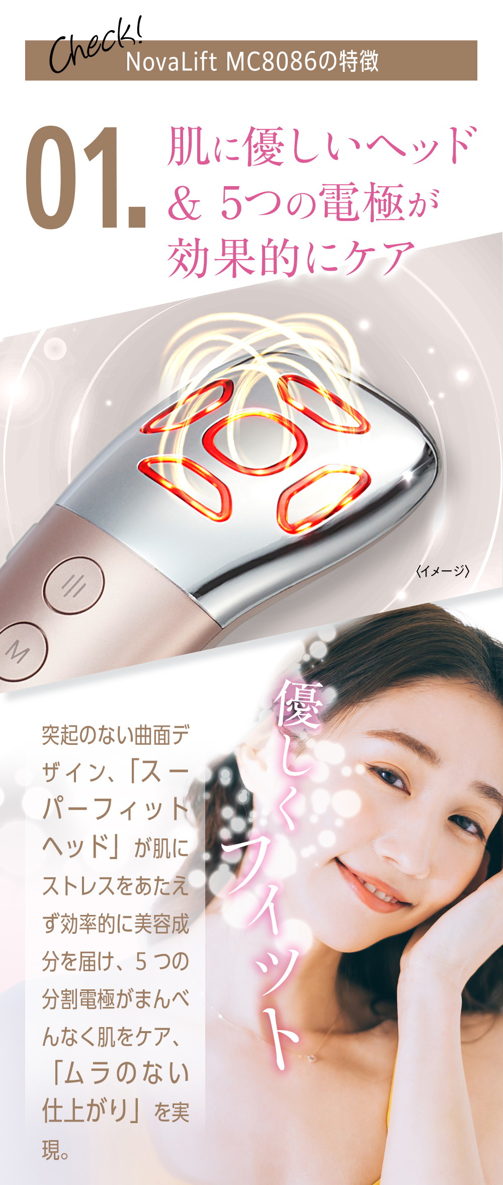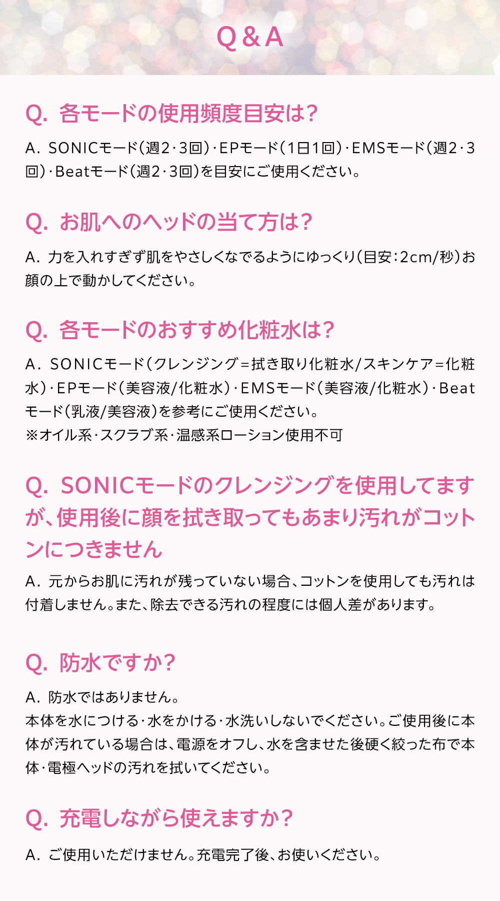 洗顔後、化粧水や美容液を塗布し、肌を整えます。本体の電源を入れ、お好みのモードを選択したら、ヘッド部分を肌に優しく当て、下から上へゆっくりと動かします。リフトアップを意識しながら、5~10分ほどケアを行い、終了後は保湿をしっかり行ってください。使用後は美顔器のヘッドを清潔に拭き取り、1日1回の使用を目安にご利用ください。