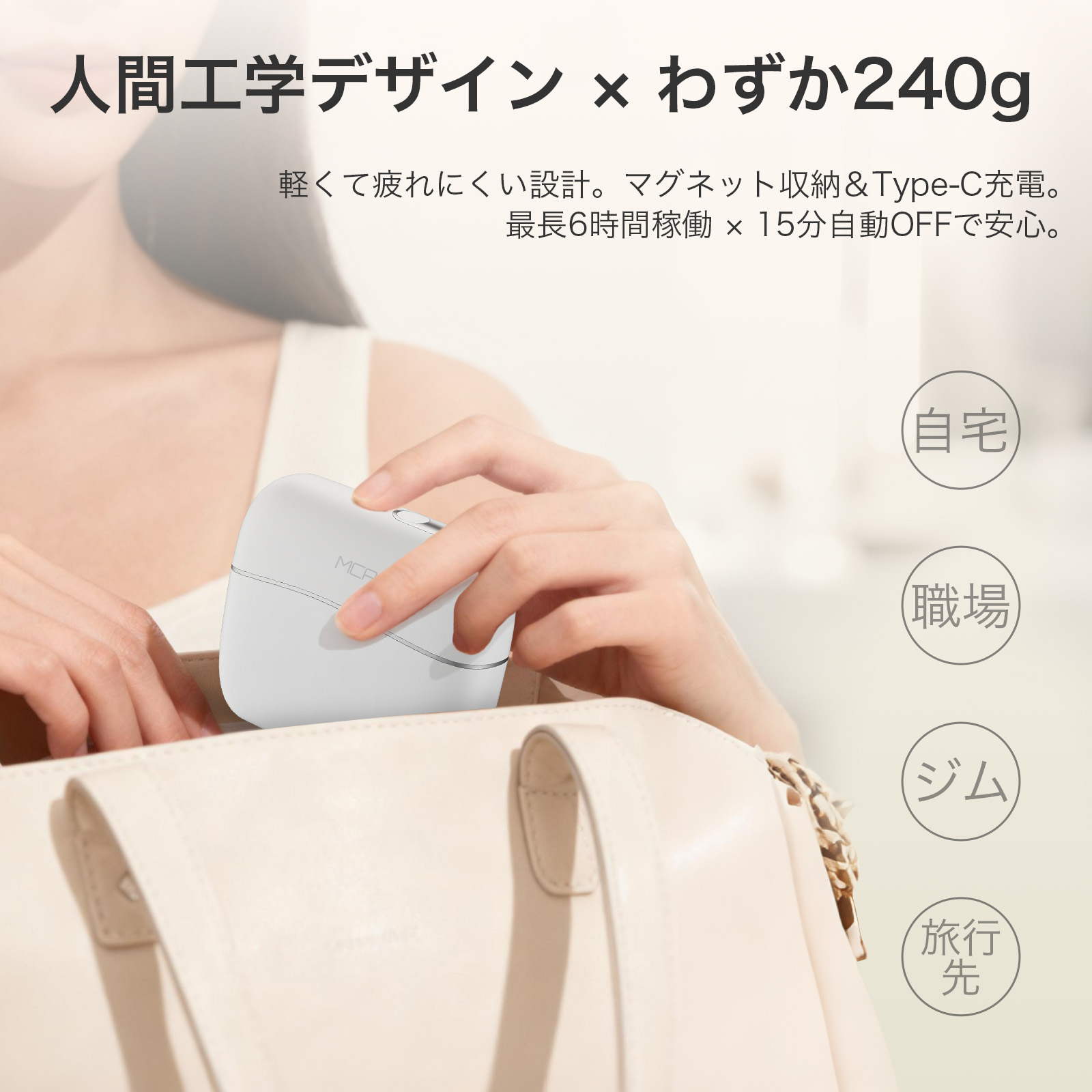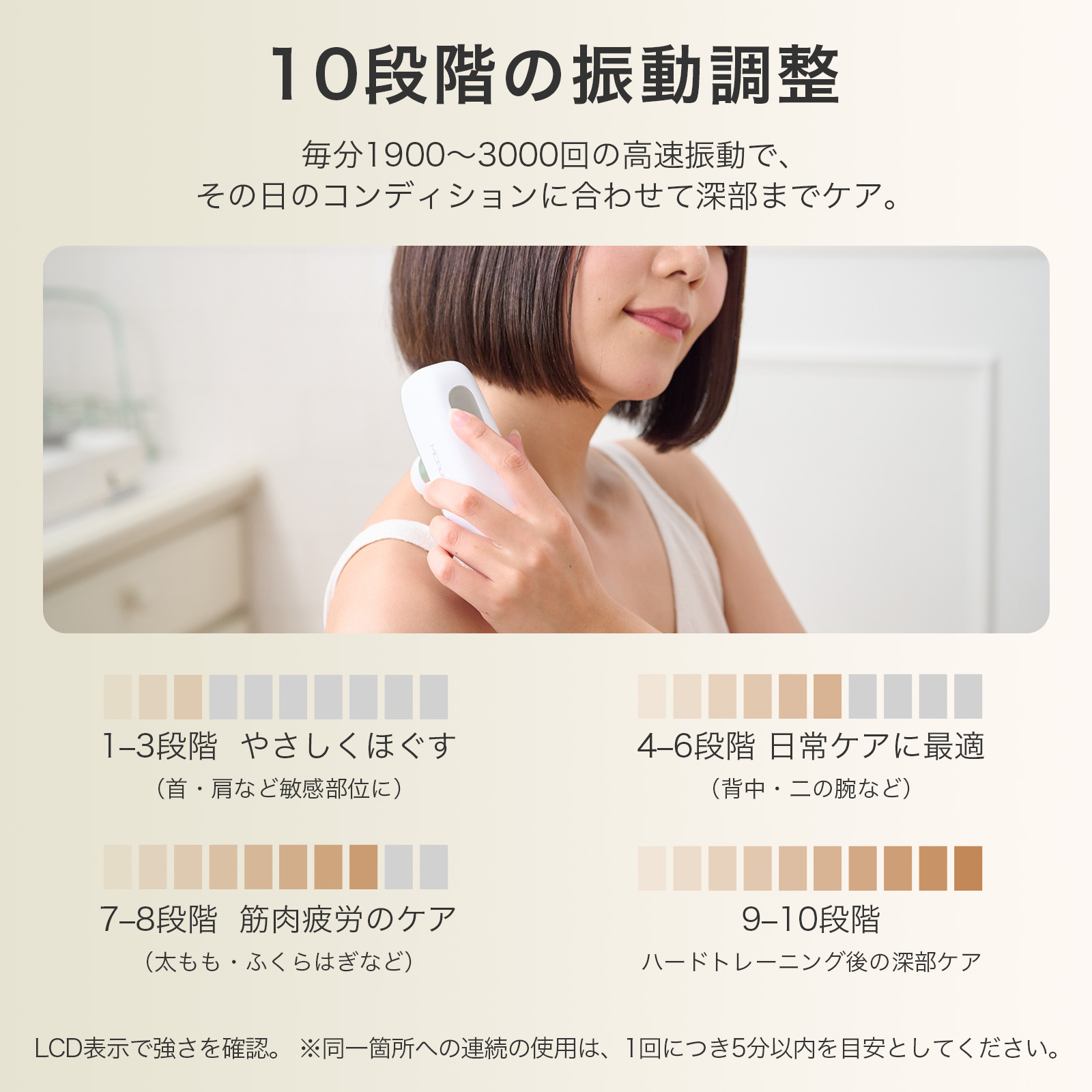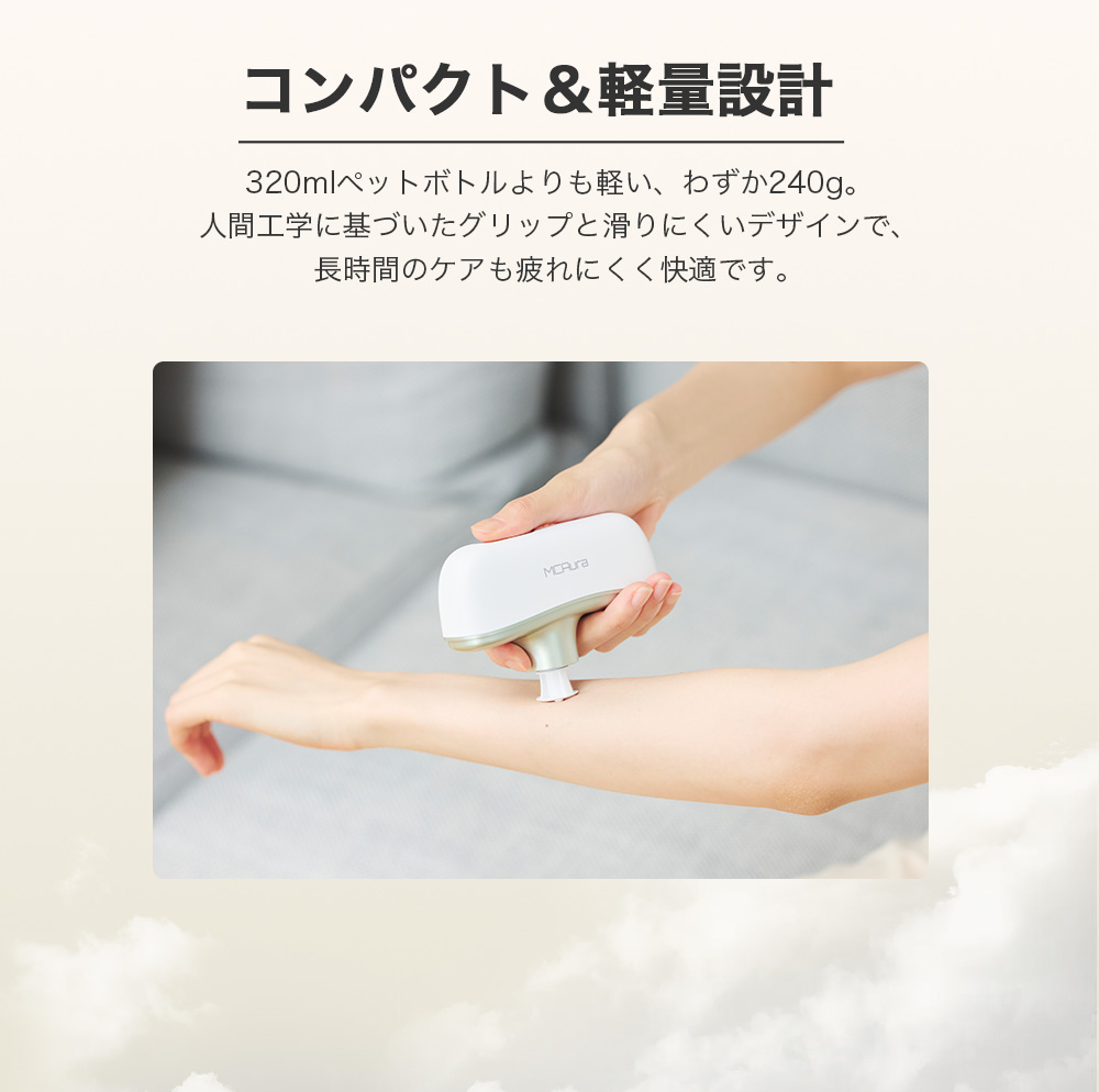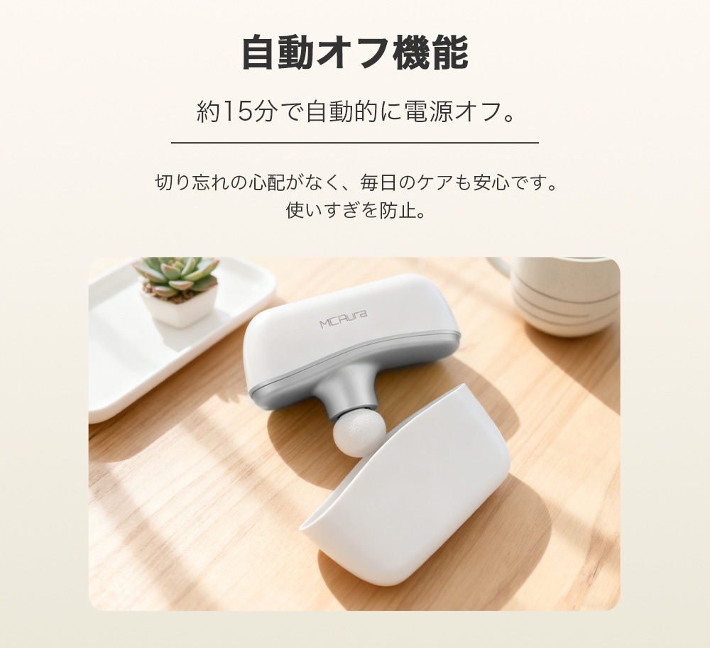 【ワンタッチで簡単操作&安心の安全設計】MCAura 筋膜リリースガンは操作が簡単で、ワンタッチで起動。10段階の振動スピードを搭載し、毎分1900~3000回の振動数をお好みに合わせて細かく調節できます。高精度のスマートセンサーが押圧の強さを感知し、自動で振動強度を調整するため、安心してお使いいただけます。低速はデリケートな部位に適し、高速は運動後の筋肉のリラックスに効果的。さまざまなシーンで幅広くご活用いただけます。軽量コンパクトな設計で、片手でも楽に操作可能。テレビ鑑賞や読書、休憩時間にも気軽に使えて快適です。さらに約15分で自動停止する安全機能を搭載し、初めての方も安心してご利用いただけます。