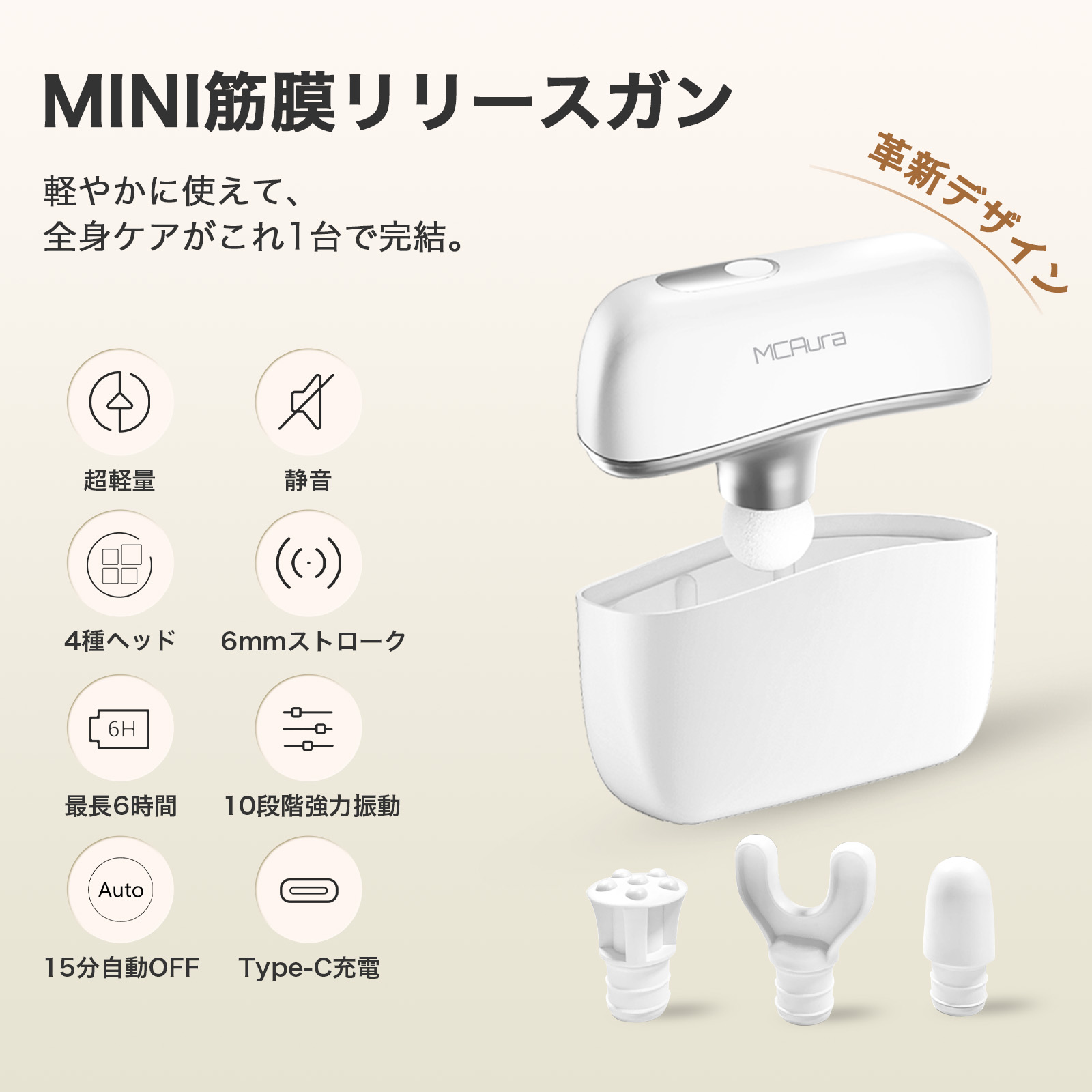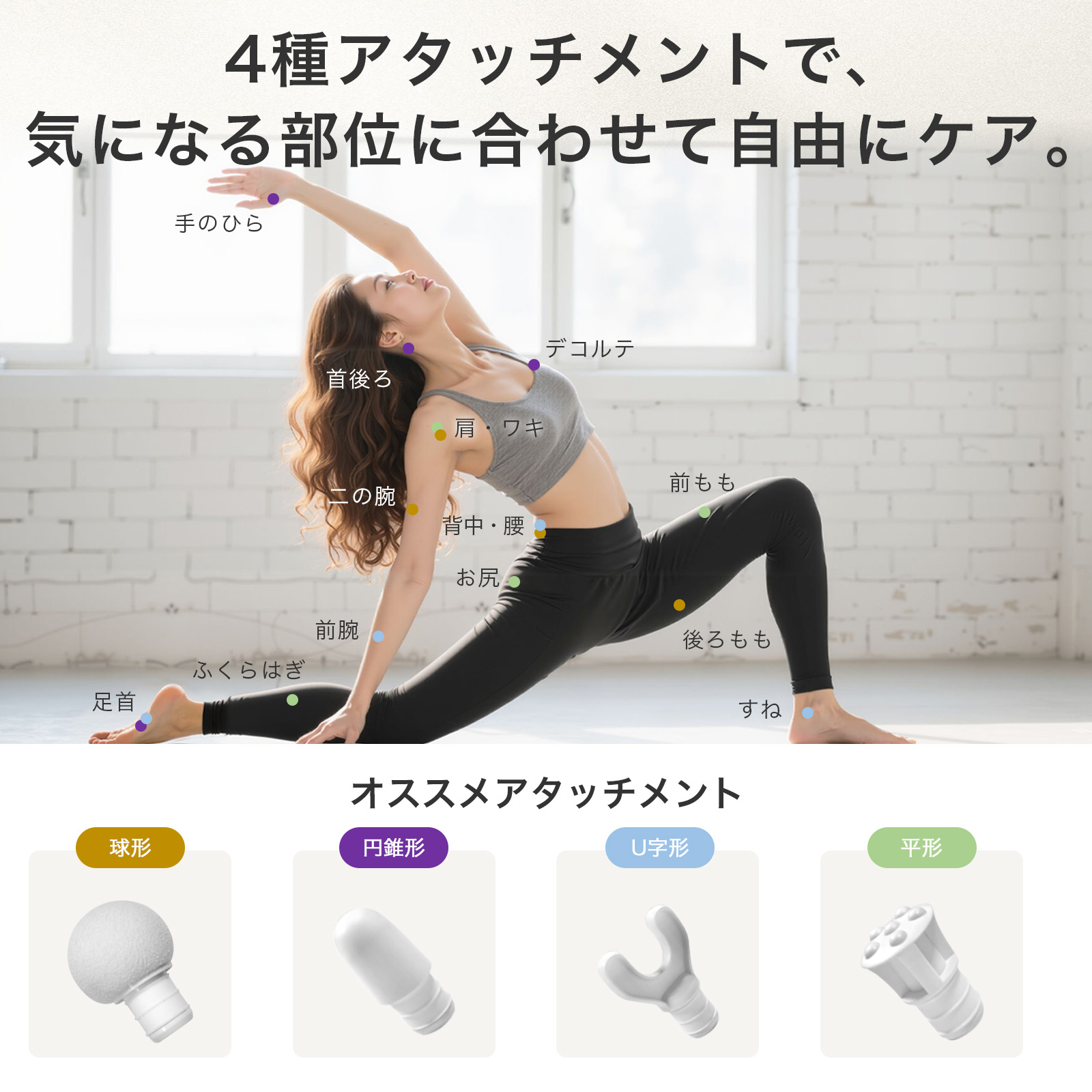 【 用途に応じて使い分ける4種類アタッチメント】半球形、円錐形、U字形、平形の4種ヘッド付き。背中や足裏、腕、フェイスラインなど部位に合わせて使い分けることで、プロのようなセルフケアを手軽に実現できる筋膜リリースです。