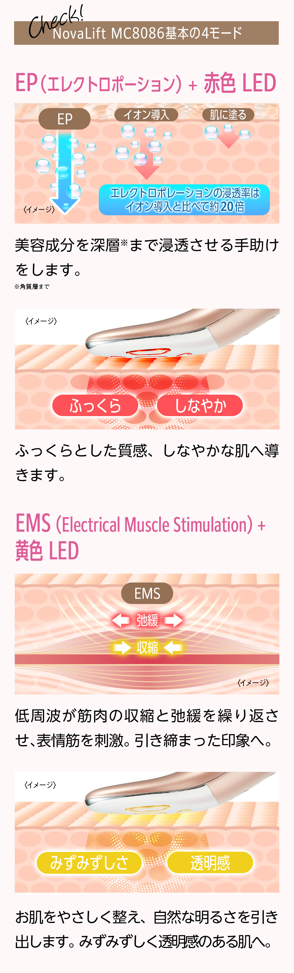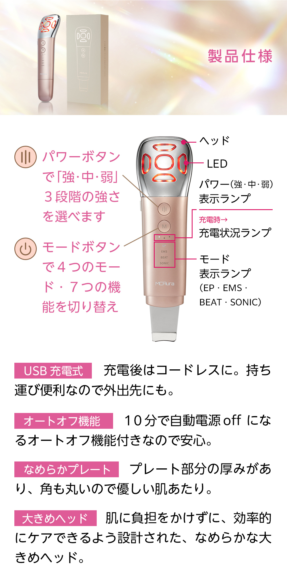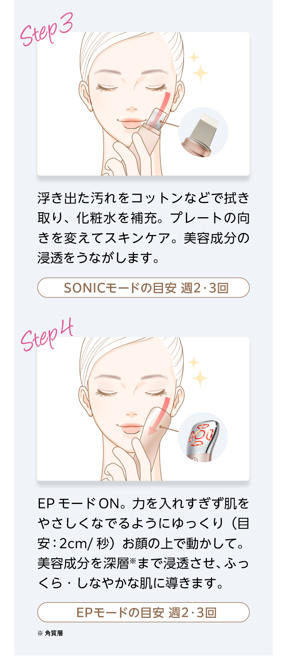 洗顔後、化粧水や美容液を塗布し、肌を整えます。本体の電源を入れ、お好みのモードを選択したら、ヘッド部分を肌に優しく当て、下から上へゆっくりと動かします。リフトアップを意識しながら、5~10分ほどケアを行い、終了後は保湿をしっかり行ってください。使用後は美顔器のヘッドを清潔に拭き取り、1日1回の使用を目安にご利用ください。
