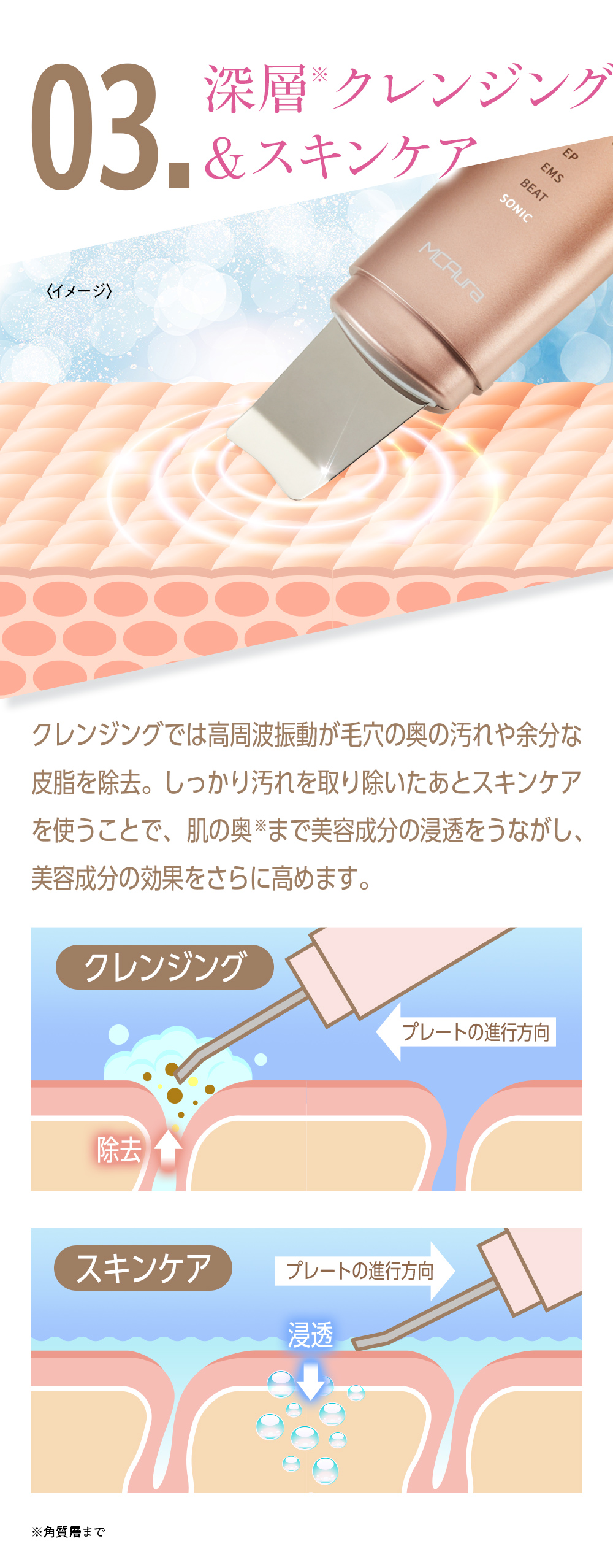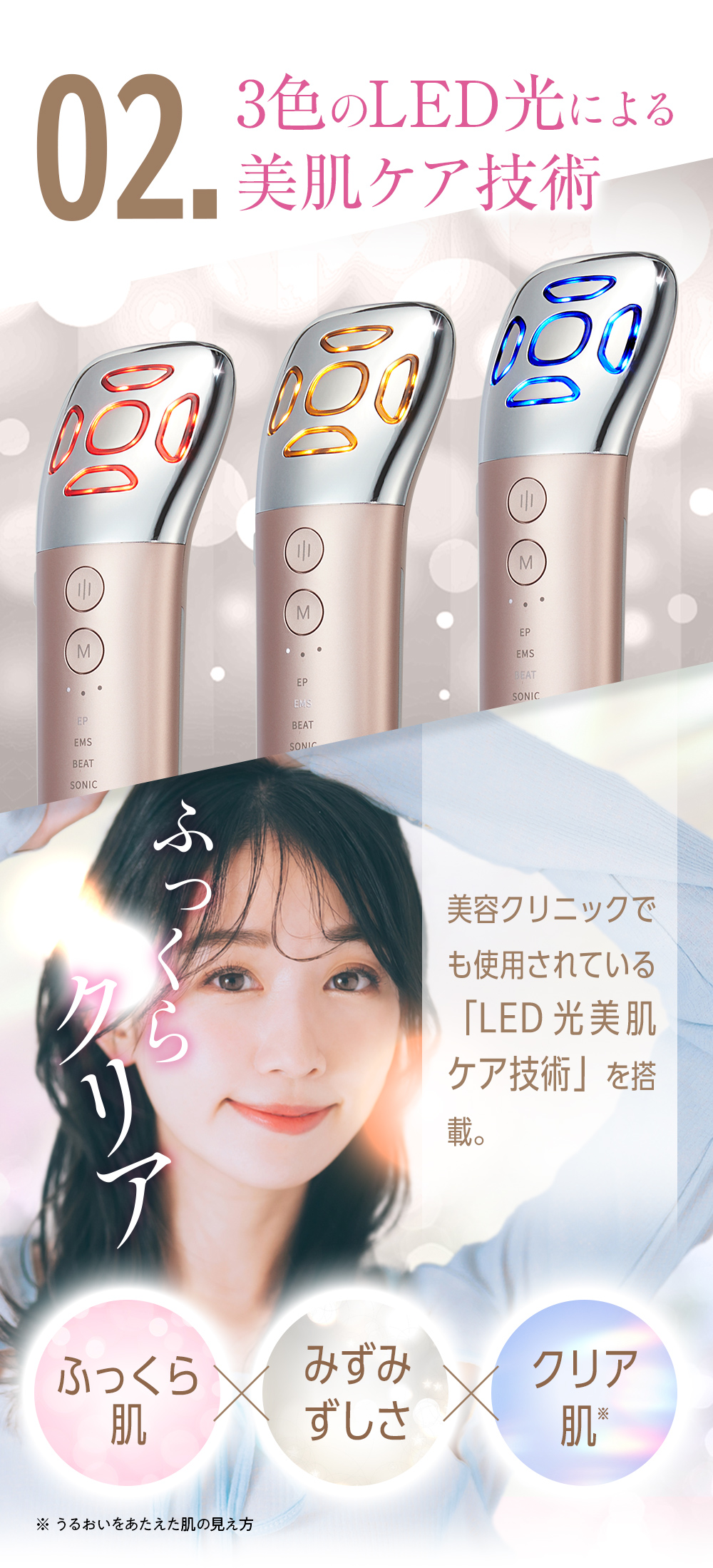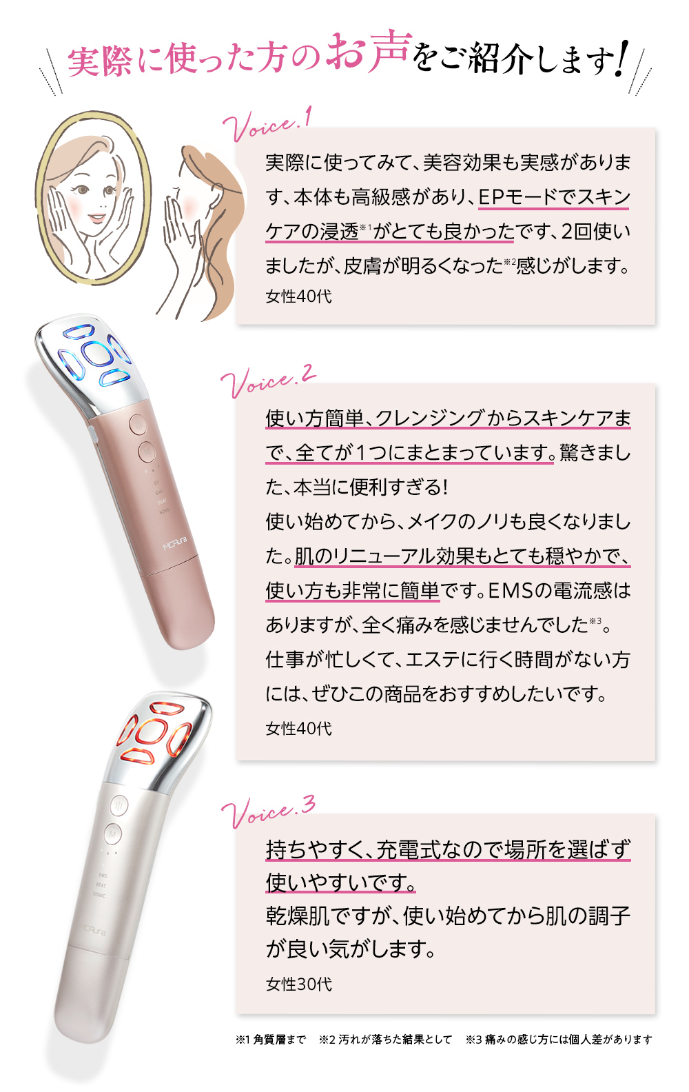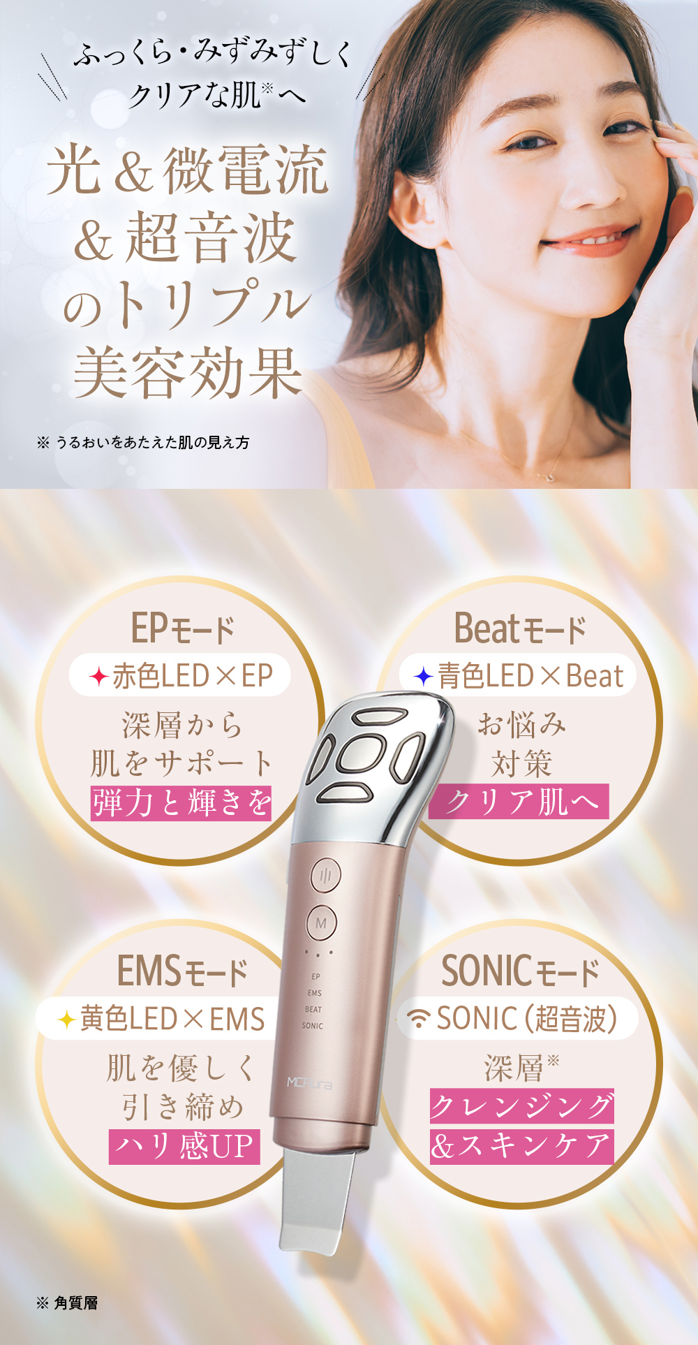 洗顔後、化粧水や美容液を塗布し、肌を整えます。本体の電源を入れ、お好みのモードを選択したら、ヘッド部分を肌に優しく当て、下から上へゆっくりと動かします。リフトアップを意識しながら、5~10分ほどケアを行い、終了後は保湿をしっかり行ってください。使用後は美顔器のヘッドを清潔に拭き取り、1日1回の使用を目安にご利用ください。
